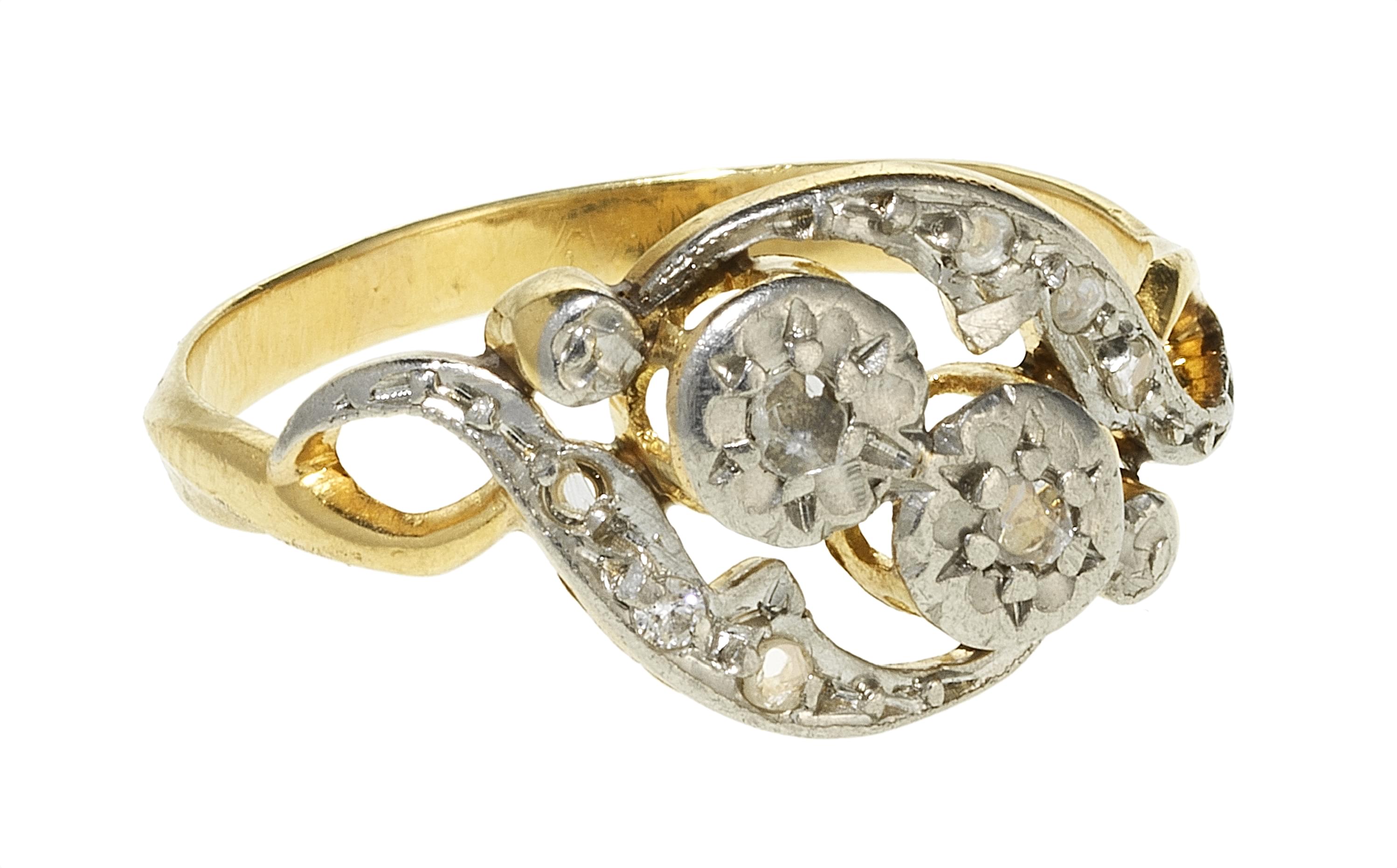 Centrée de deux motifs en Toi et Moi sertis chacun d'une rose de diamant et rehaussés de roses de diamant, travail français XIXe s, or 750 et argent, doigt 60-20. Pour les lots précédés d'un *, la TVA de 7,7% est due sur l'entier du prix d'adjudication.