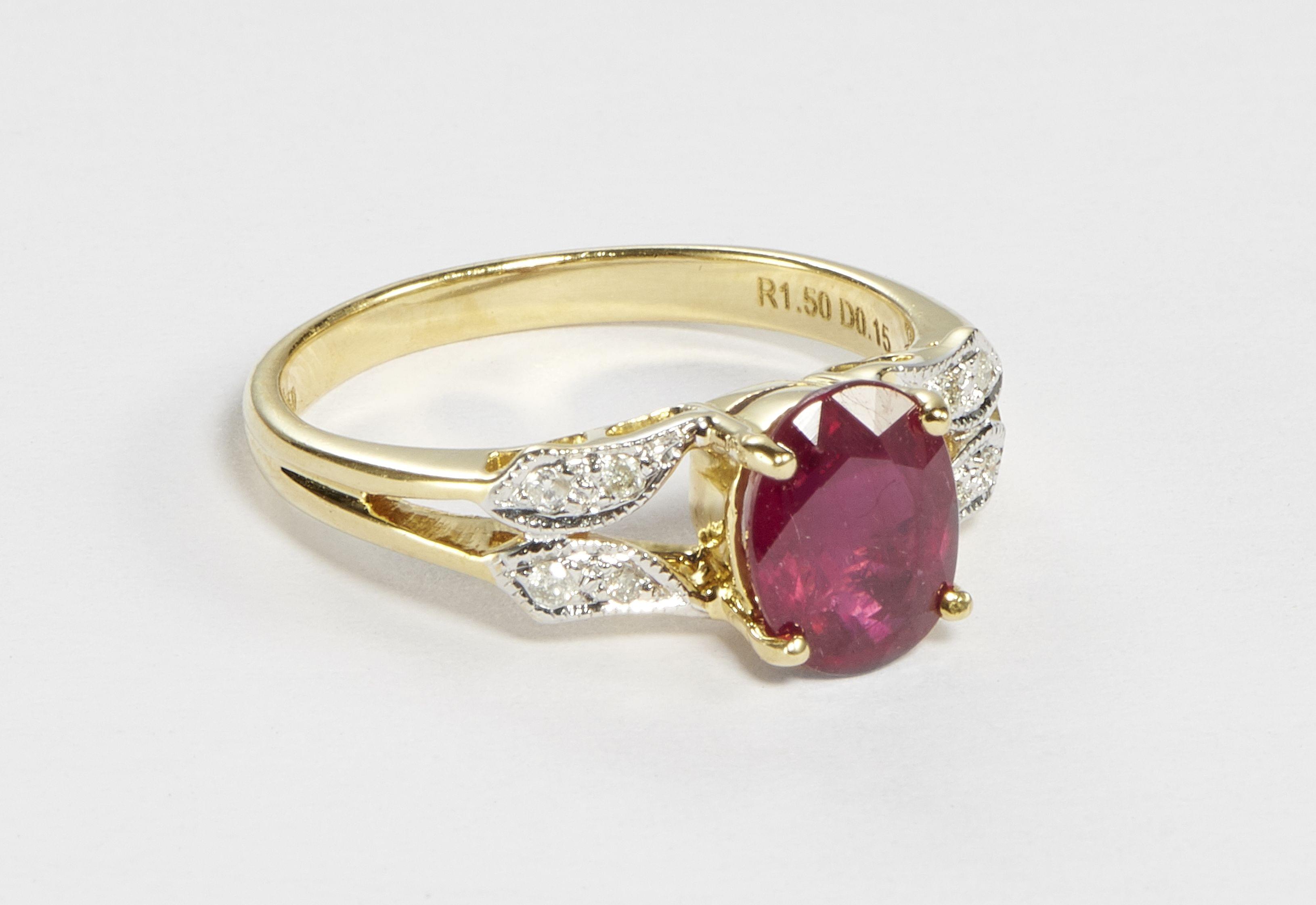 3211. Bague ajourée sertie d'un rubis taille ovale (env. 1,3 ct) épaulé de diamants