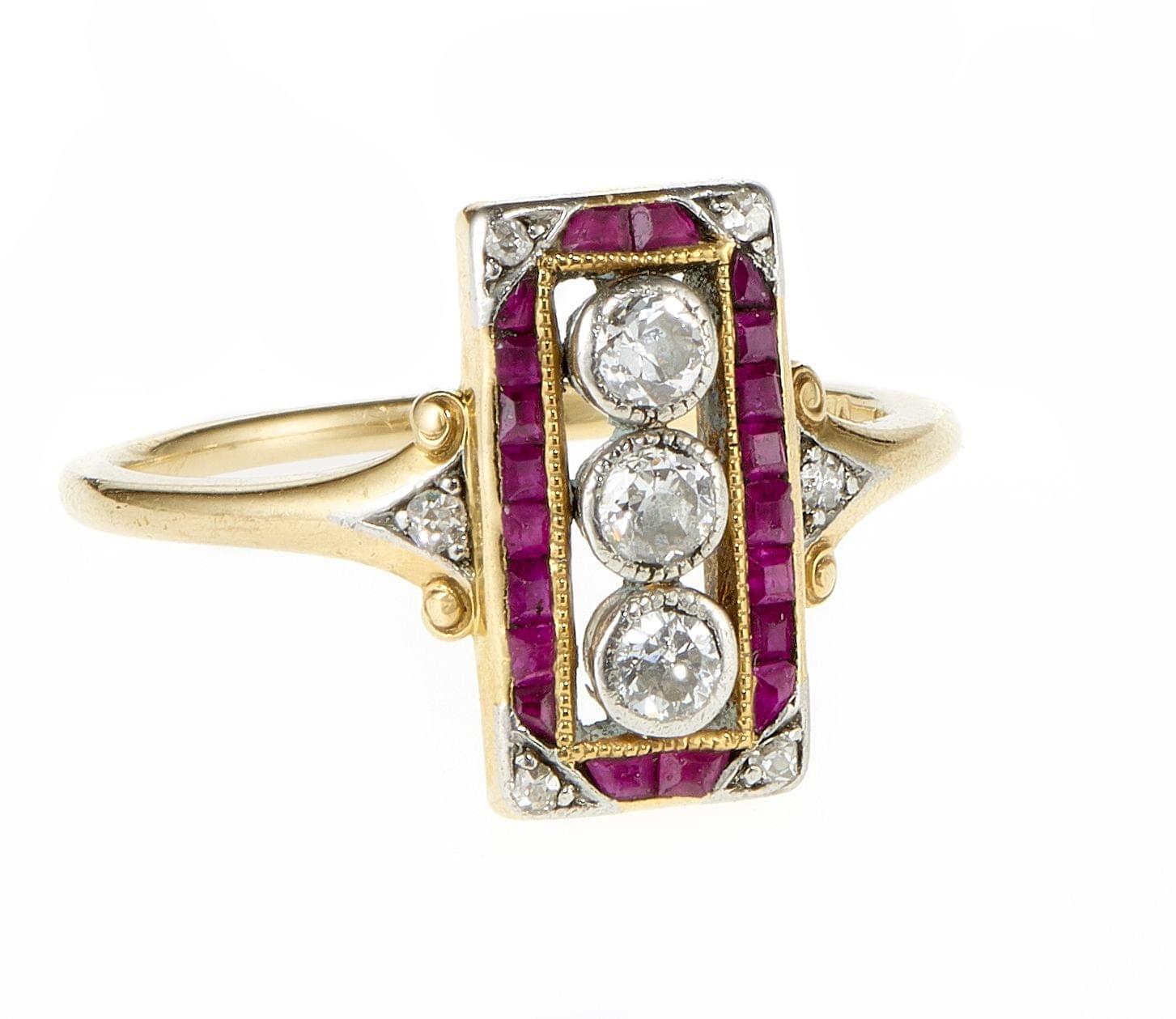 4276. Bague Art déco sertie de trois diamants taille ancienne entourés de rubis calibrés et de diamants taille rose
