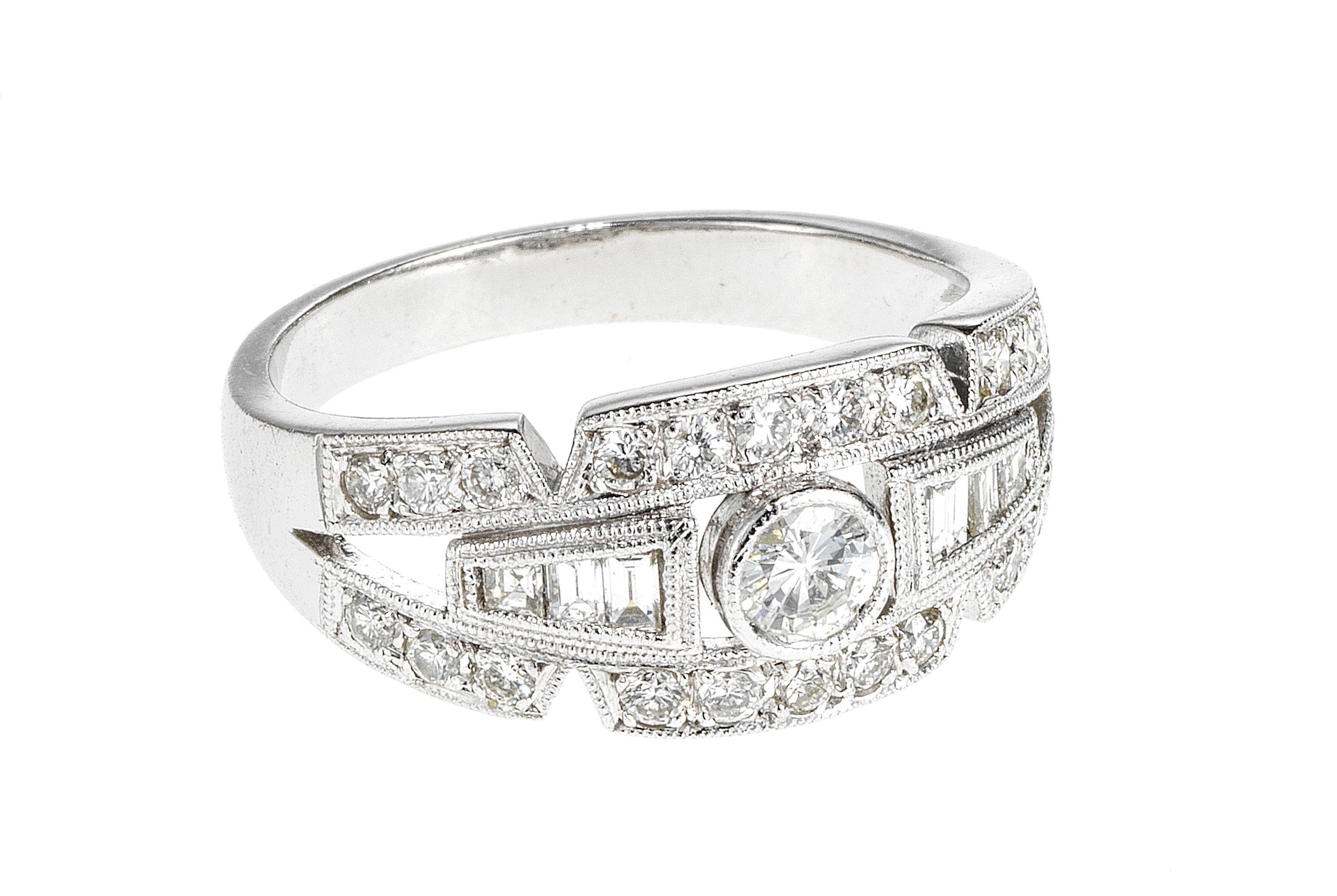 3417. Bague bandeau ajourée centrée d'un diamant (env. 0,2 ct) entouré de diamants taille baguette et brillant