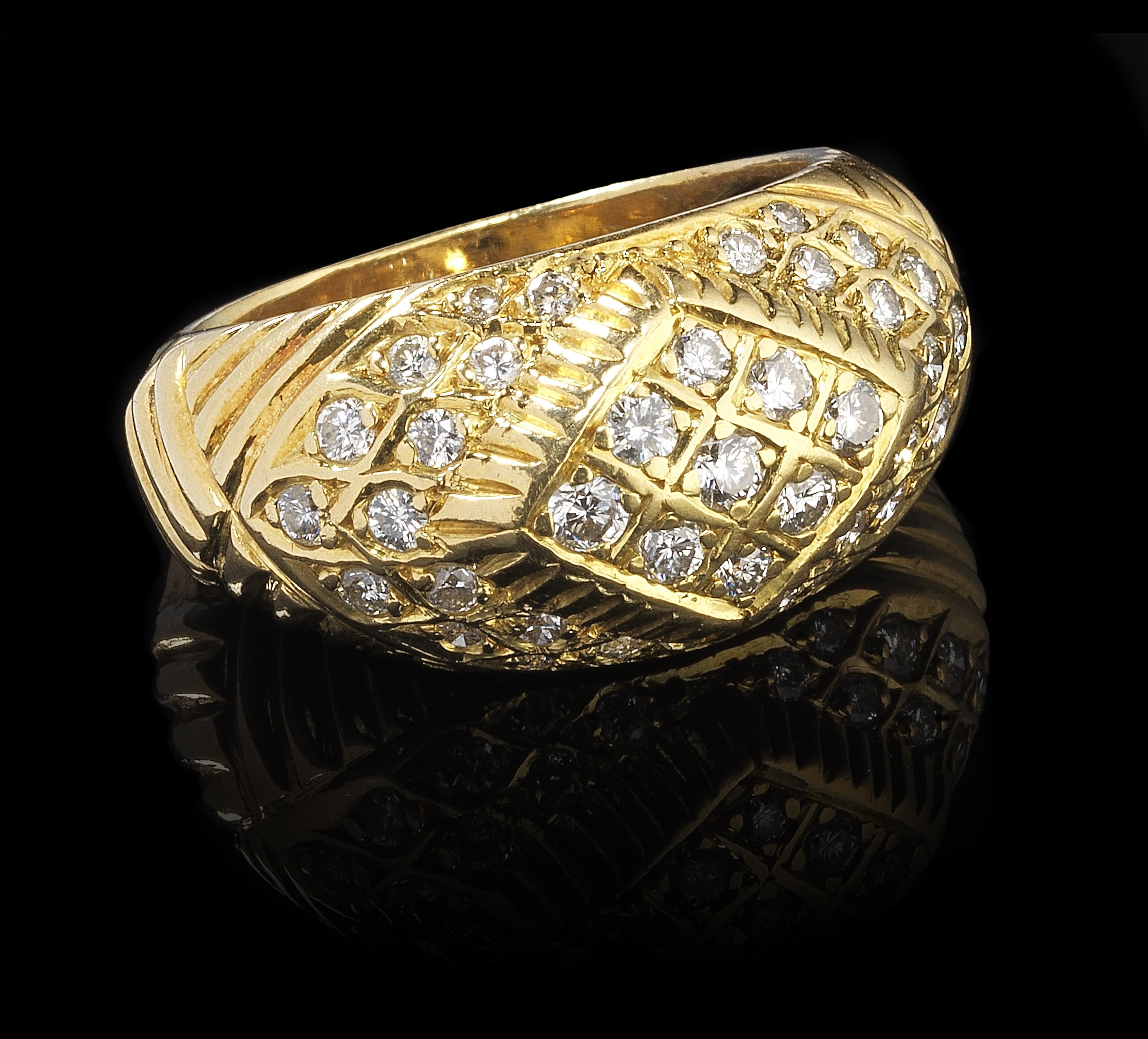 3230. Bague bandeau bombée centrée d'un motif de losange et pavée de diamants