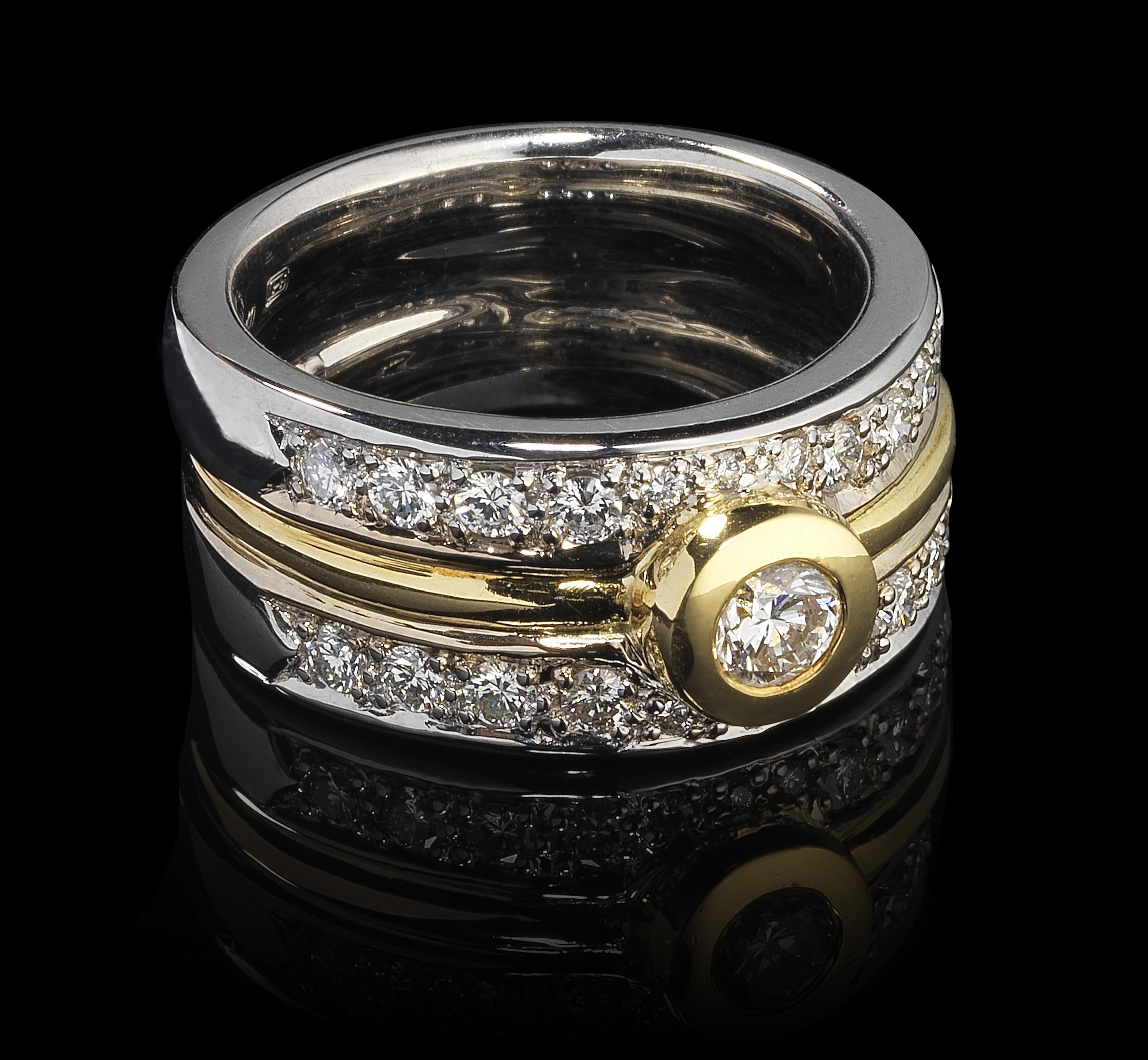 Rehaussé de deux lignes de pavages de diamants, or et or gris 750, doigt 54-14, 17 g