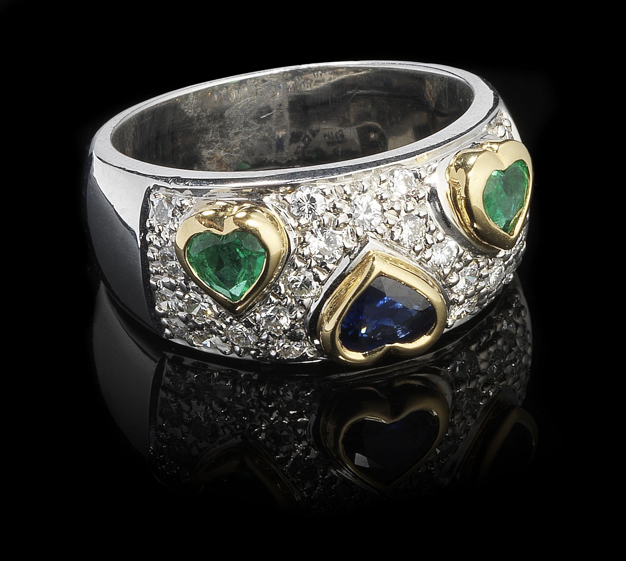 3297. Bague bandeau ornée de trois motifs de coeurs sertis, l'un d'un saphir et les deux autres d'émeraudes, dans un pavage de diamants