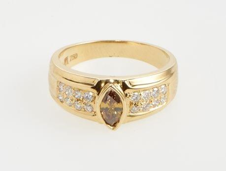 3266. Bague bandeau sertie d'un diamant cognac taille marquise épaulé de diamants