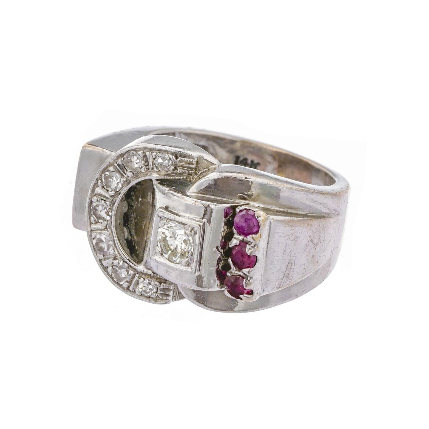 904. Bague ceinture sertie d'un diamant épaulé d'une ligne de diamants et d'une ligne de rubis