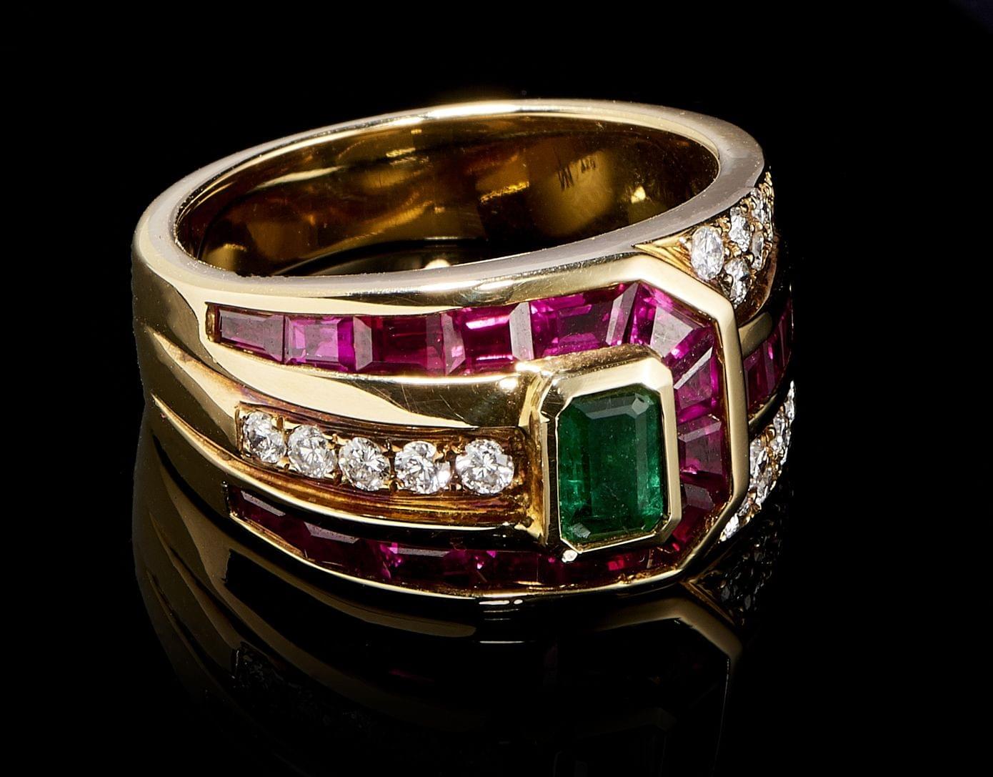 95. Bague ceinture sertie d'une émeraude taille émeraude entourée de rubis calibrés et rehaussée de lignes de diamants