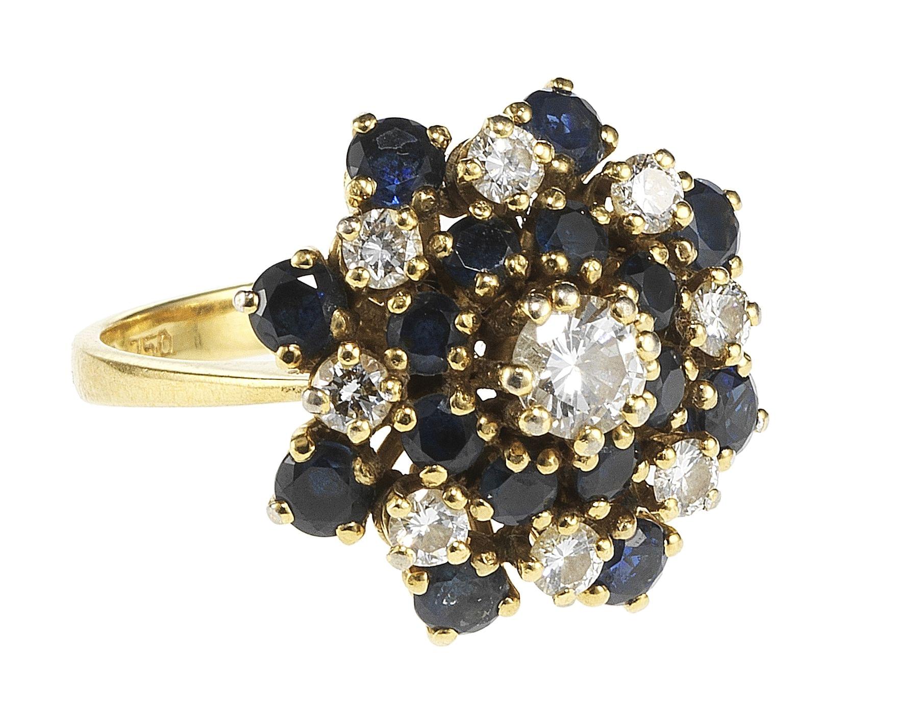 3281. Bague centrée d'un diamant (env. 0,3 ct) entouré de saphirs et de diamants formant un motif de fleur