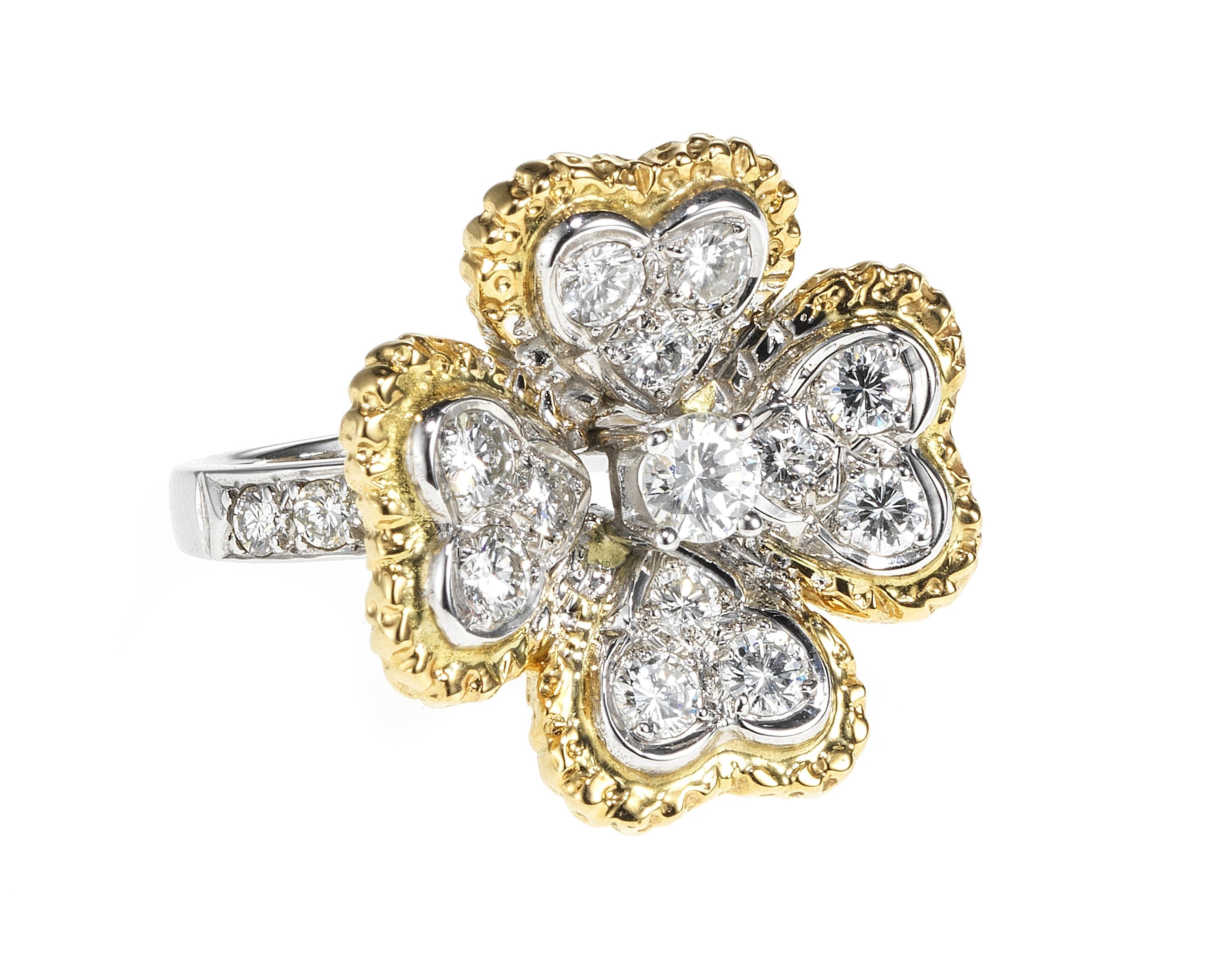 3416. Bague centrée d'un diamant formant un trèfle à quatre feuilles pavées de diamants
