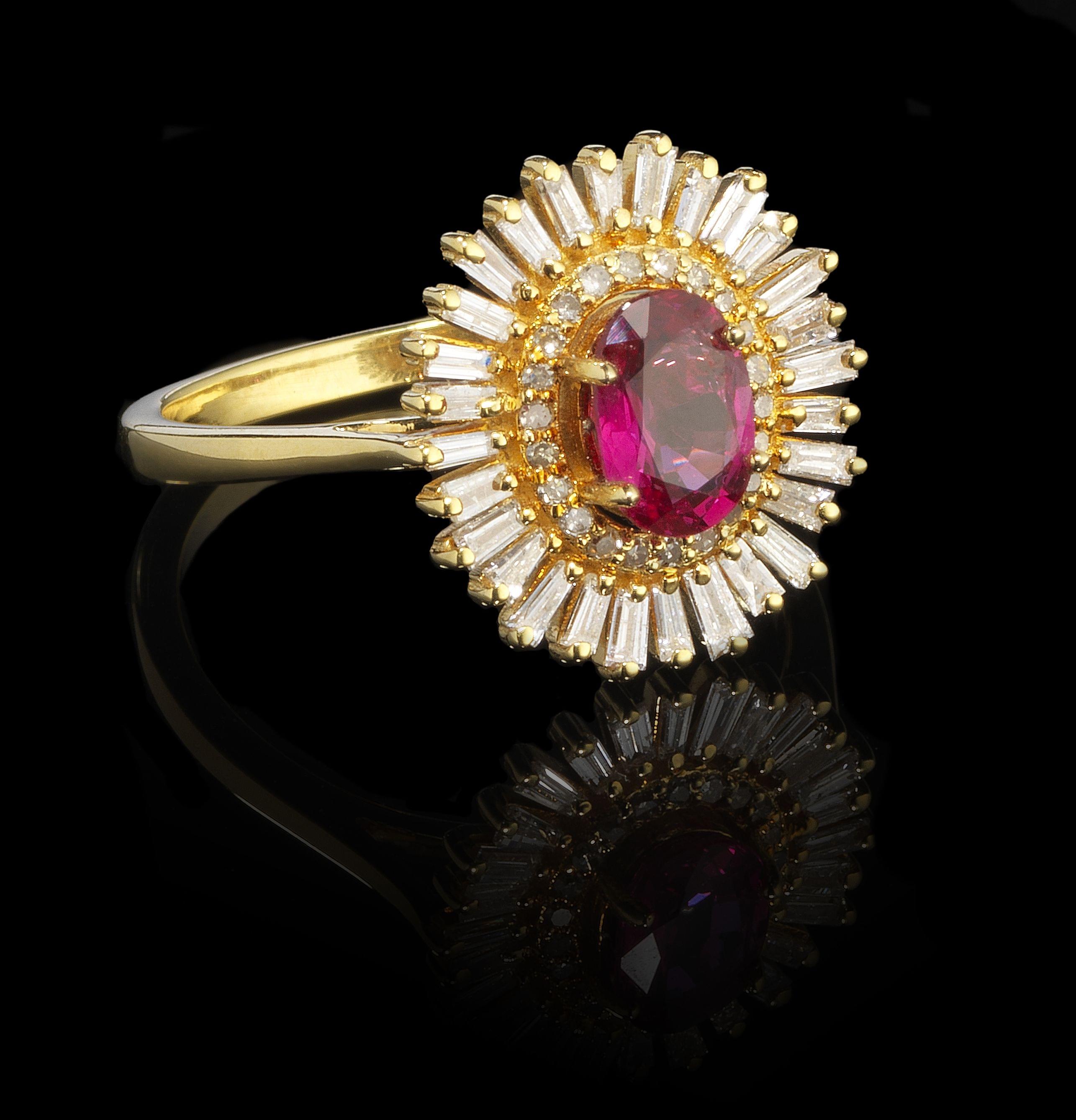 Entouré de diamants taille baguette et brillant (total env. 0,5 ct), or 585, doigt 54-14, 3 g, avec un certificat GFCO. Pour les lots précédés d'un *, la TVA de 7,7% est due sur l'entier du prix d'adjudication.