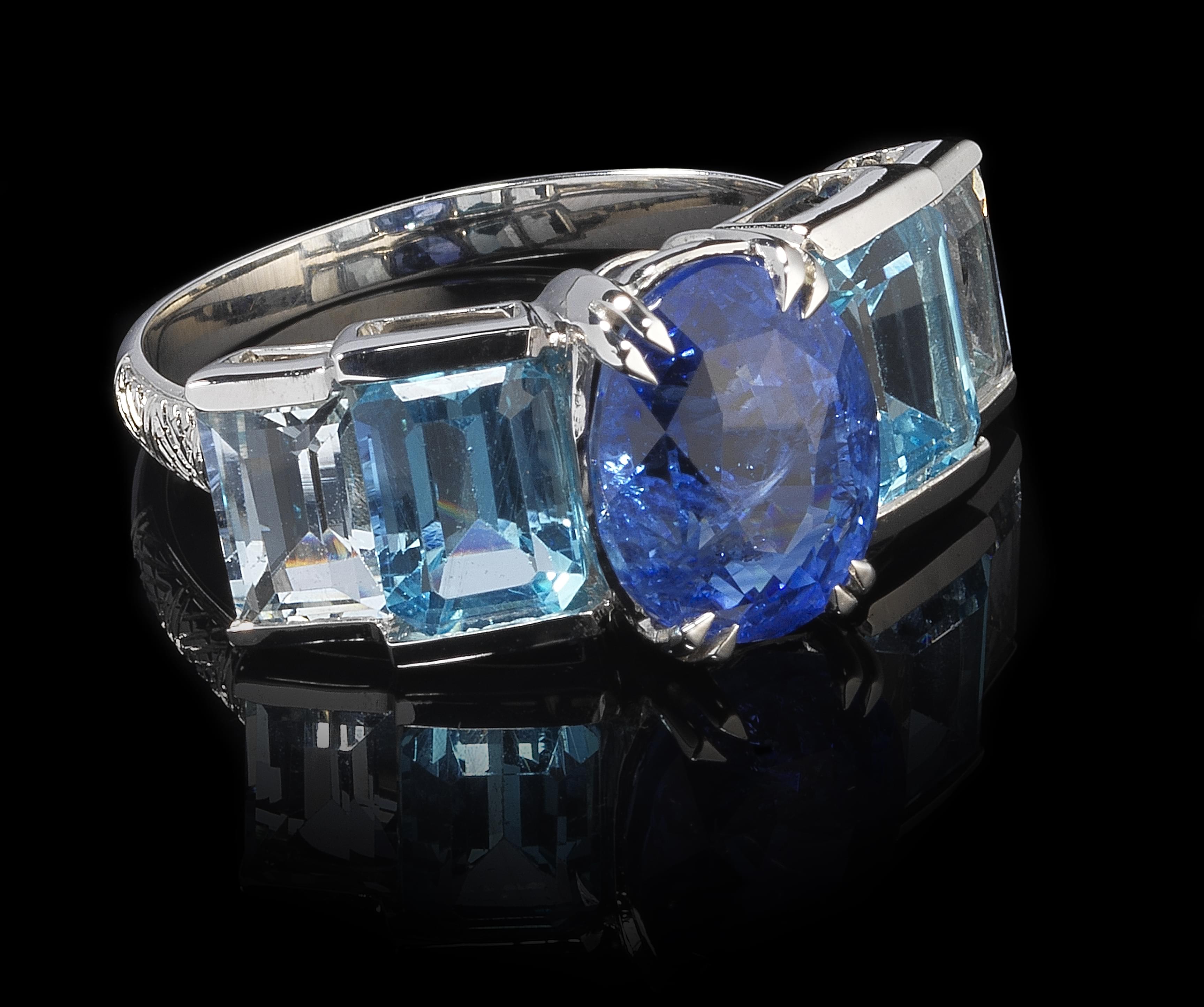 Epaulé de topazes bleues et d'aigues-marines taille rectangle, or gris 750, doigt 54-14, 4 g, accompagnée d'un certificat GFCO. Pour les lots précédés d'un *, la TVA de 7,7% est due sur l'entier du prix d'adjudication.