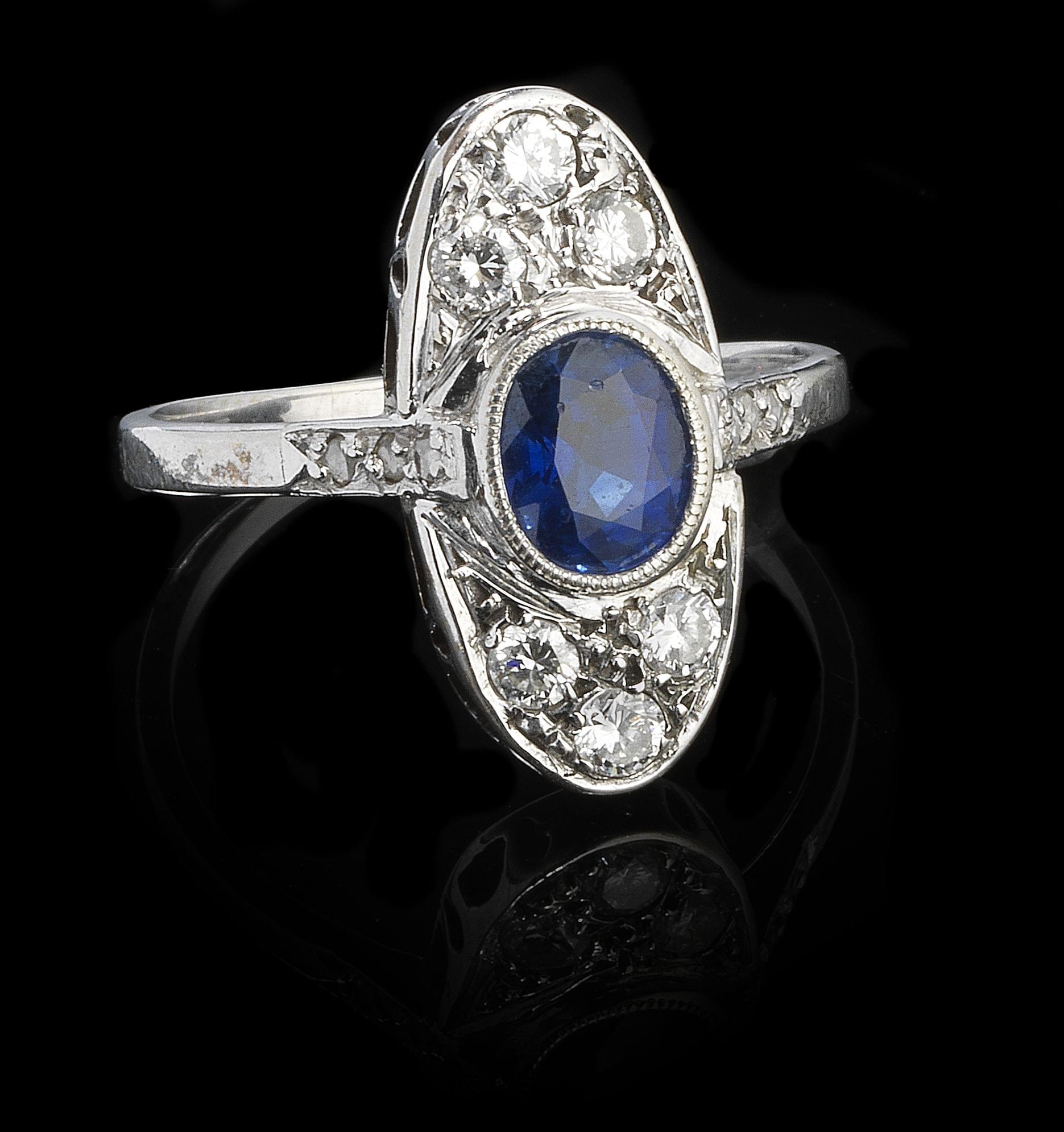 3256. *Bague centrée d'un saphir taille ovale (env. 0,7 ct) dans un pavage de diamants