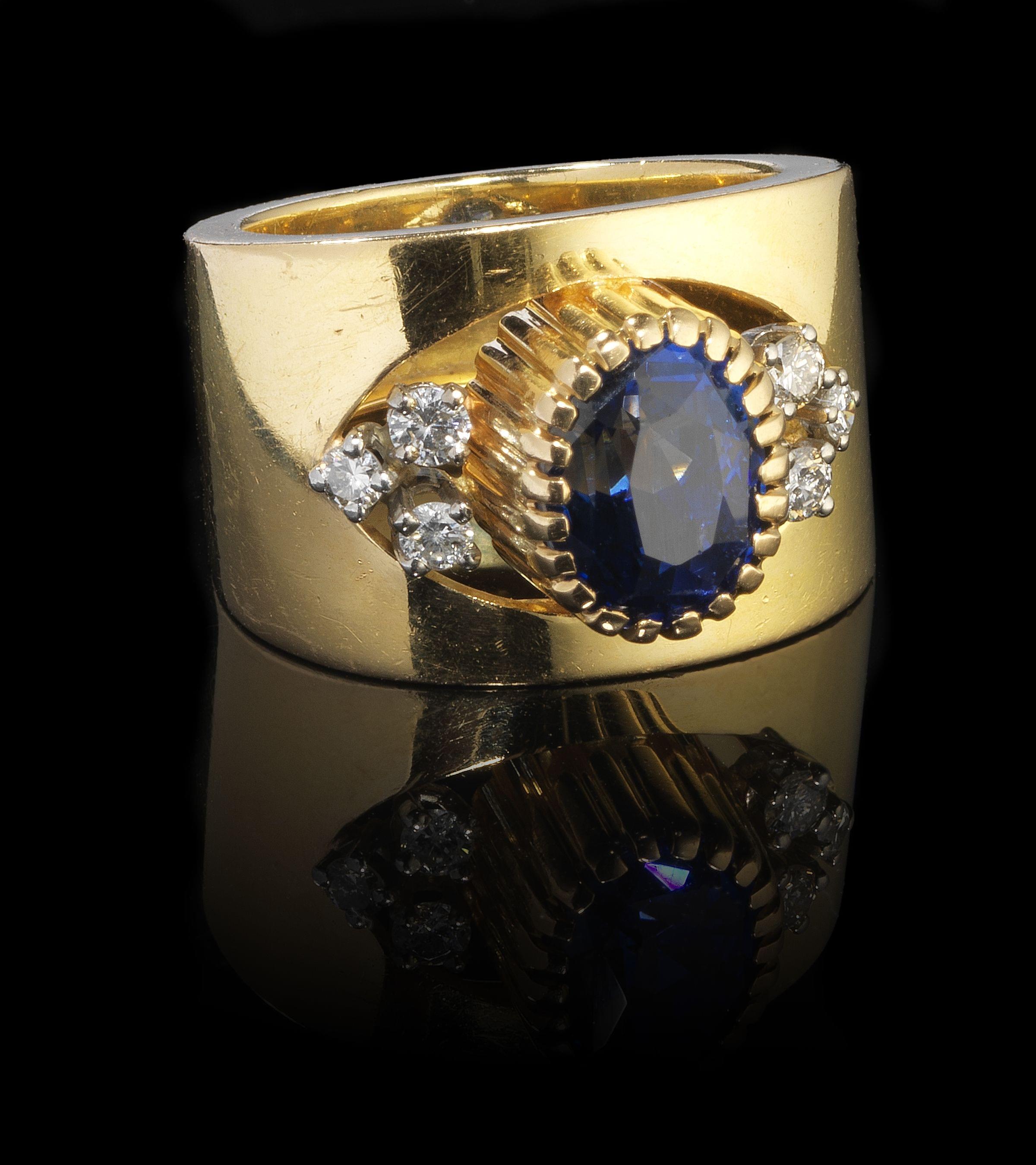 186. Bague centrée d'un saphir taille ovale (env. 4,4 ct) épaulé de six diamants (env. 0,3 ct)