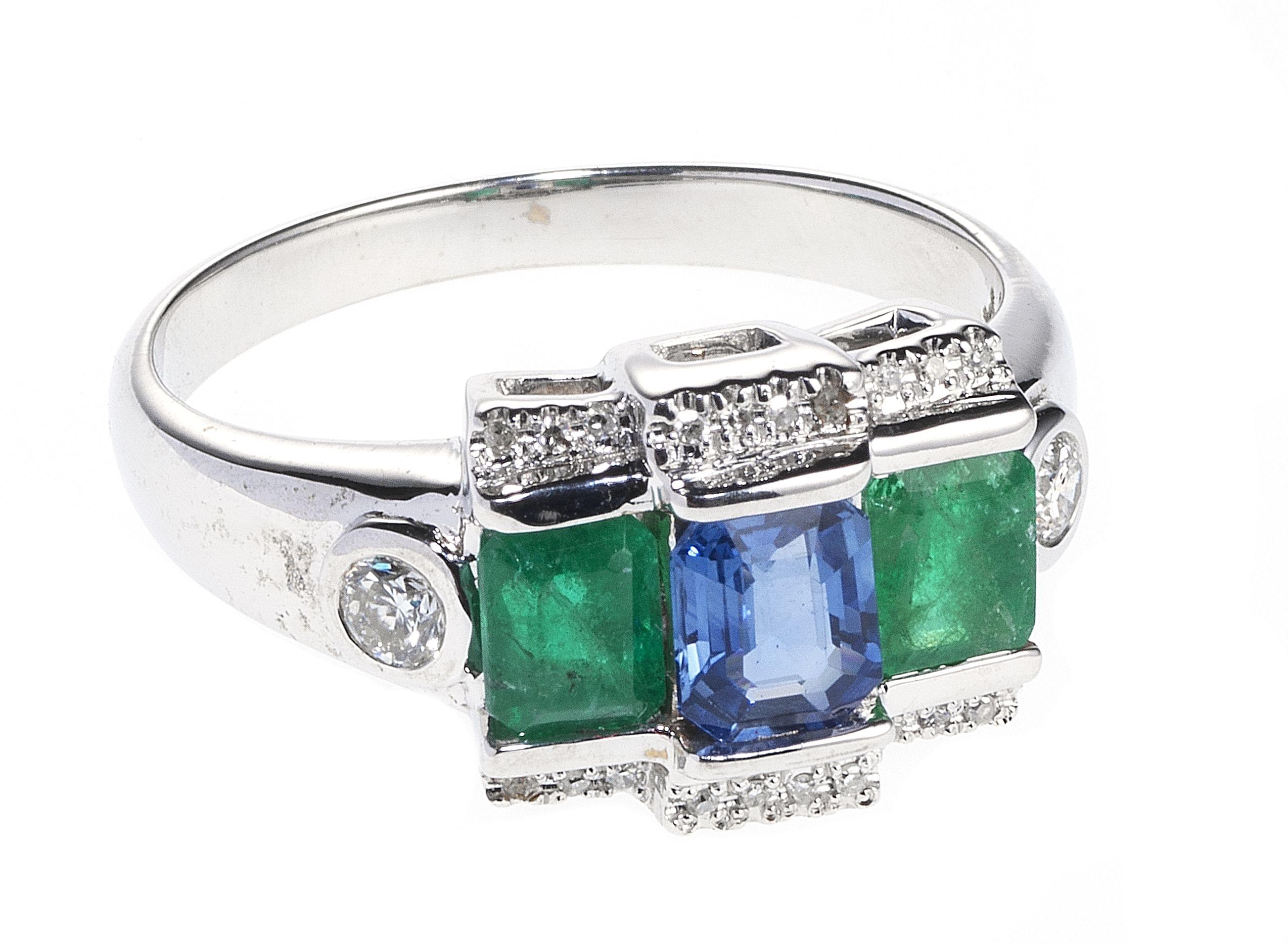3226. *Bague centrée d'un saphir taille rectangle (env. 0,45 ct) épaulé de deux émeraudes taille rectangle (env. 0,6 ct) rehaussées de diamants