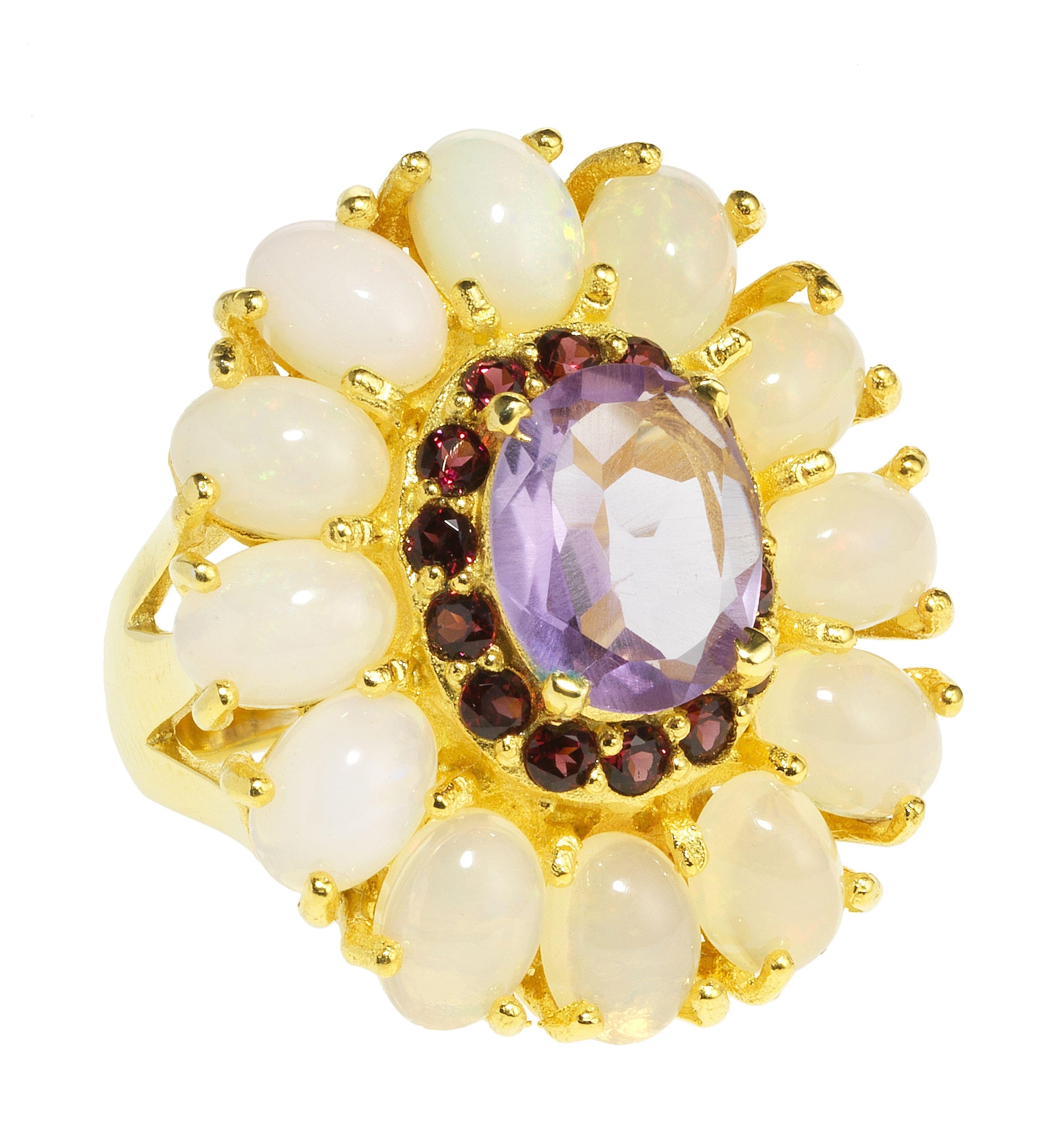 3019. *Bague centrée d'une améthyste taille ovale entourée de grenats et d'opales à fond blanc