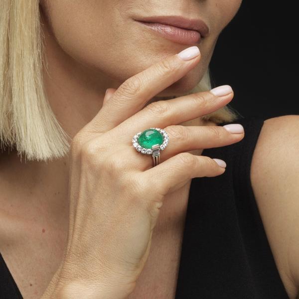 166. Bague centrée d'une émeraude de Colombie taille cabochon ovale, minor oil, (env. 12 ct) entourée de diamants (env. 1,4 ct) et épaulée de