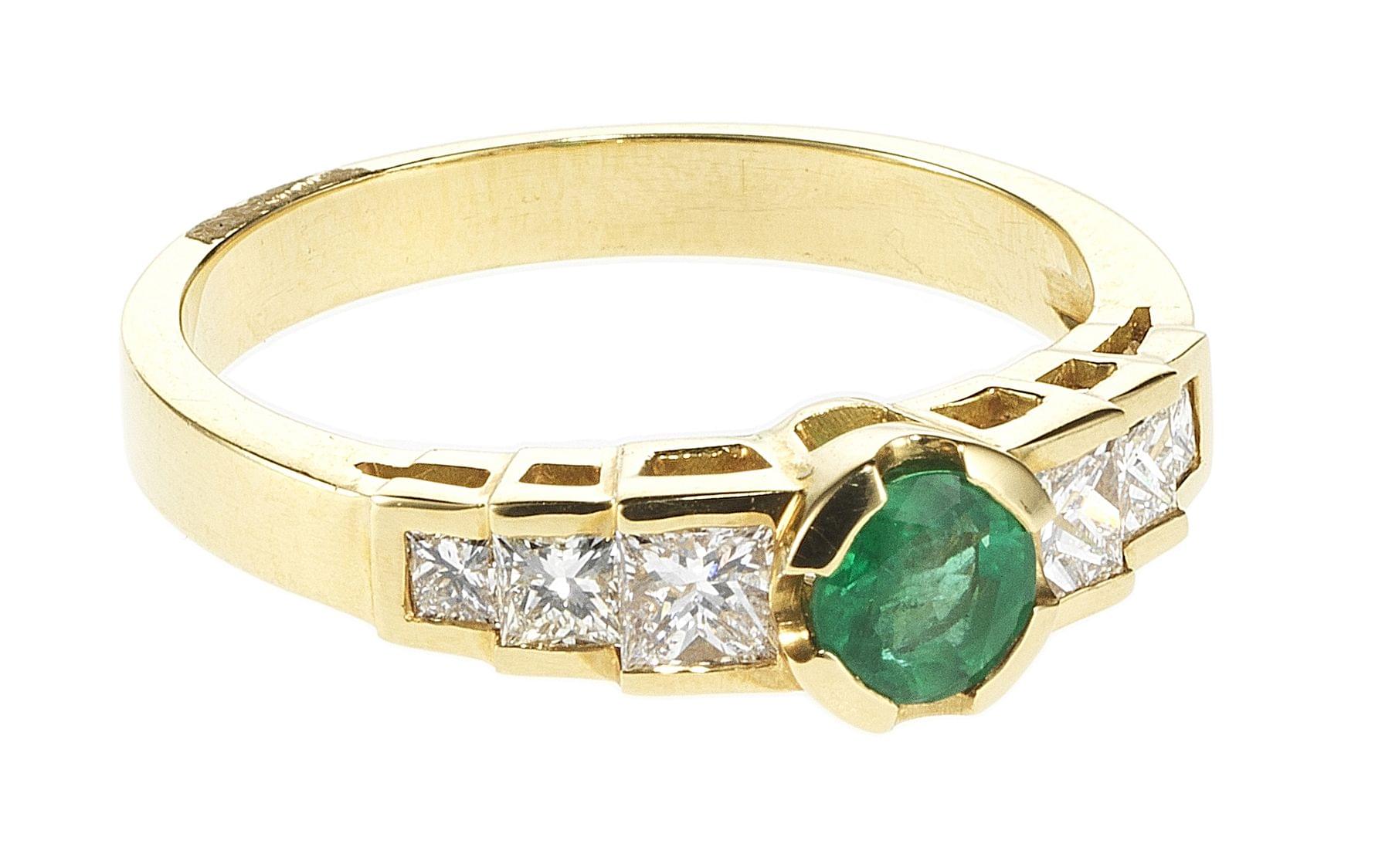 3296. Bague centrée d'une émeraude taille brillant (env. 0,35 ct) épaulée de part et d'autre de trois diamants taille princesse