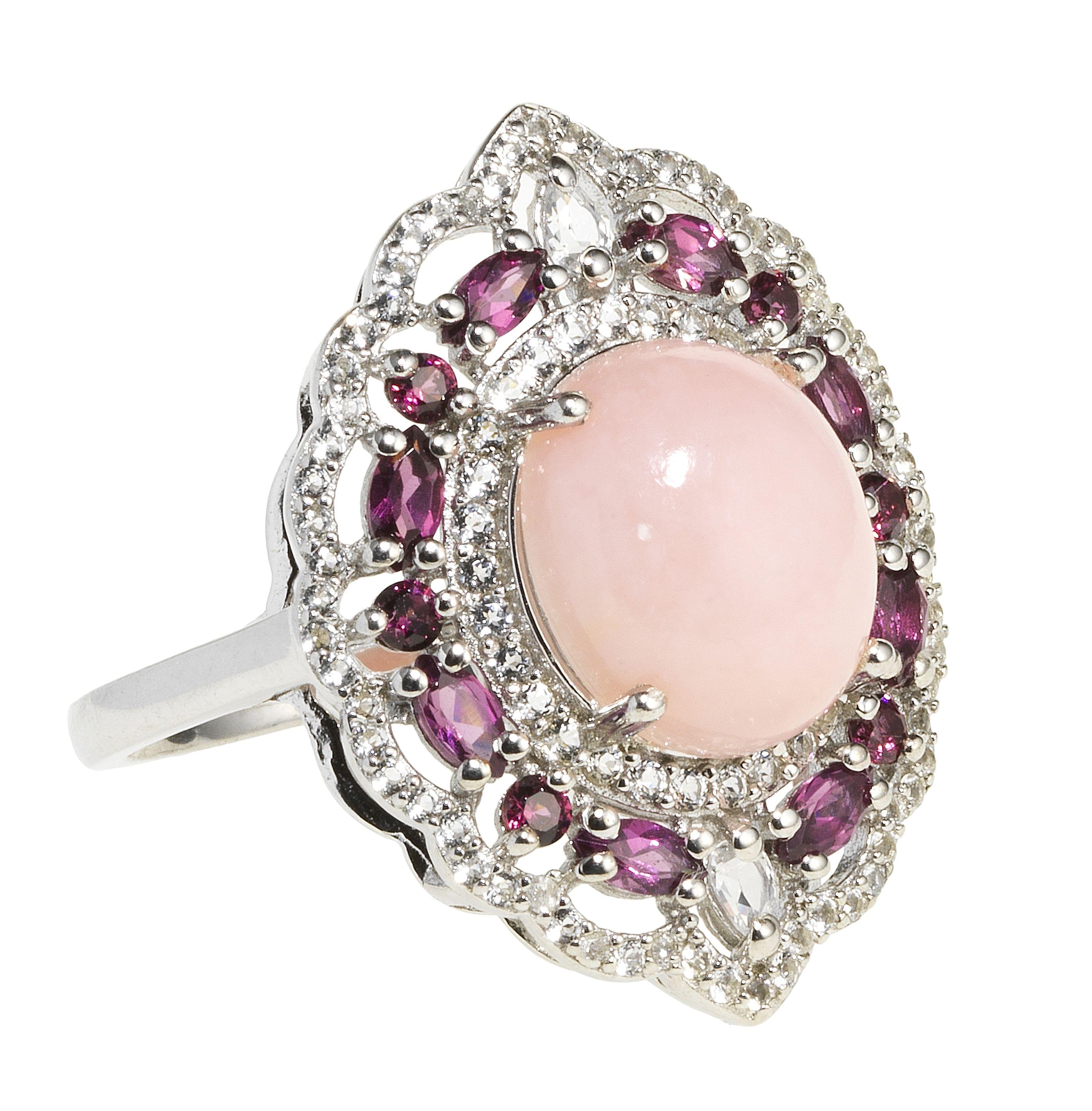 3403. *Bague centrée d'une opale rose taille cabochon ovale entourée de rhodolites et de pierres d'imitation pour le diamant