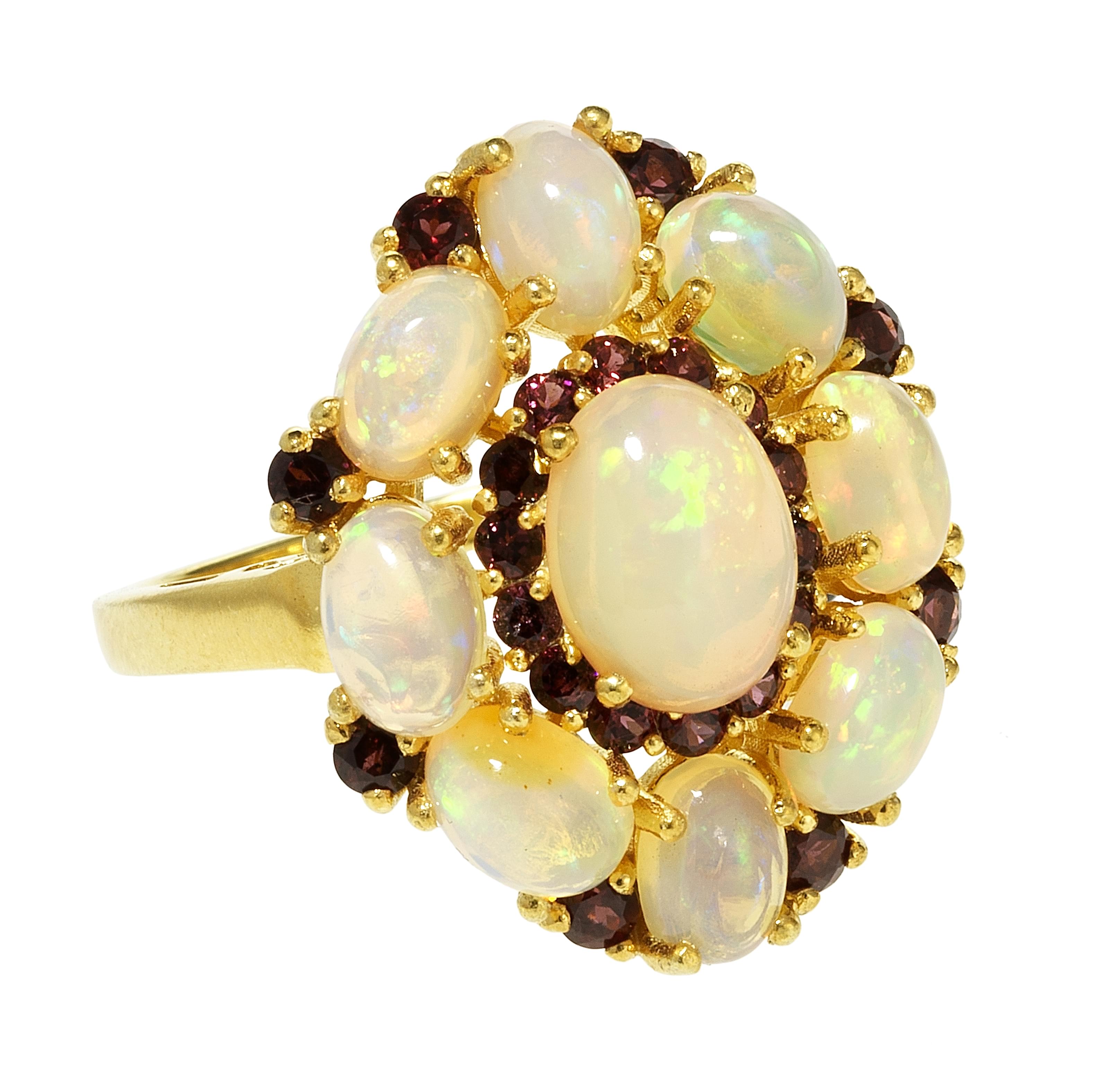 Entourée de grenats taille brillant et d'opales taille cabochon ovale alternées de grenats, vermeil 925, doigt 57-17. Pour les lots précédés d'un *, la TVA de 7,7% est due sur l'entier du prix d'adjudication.