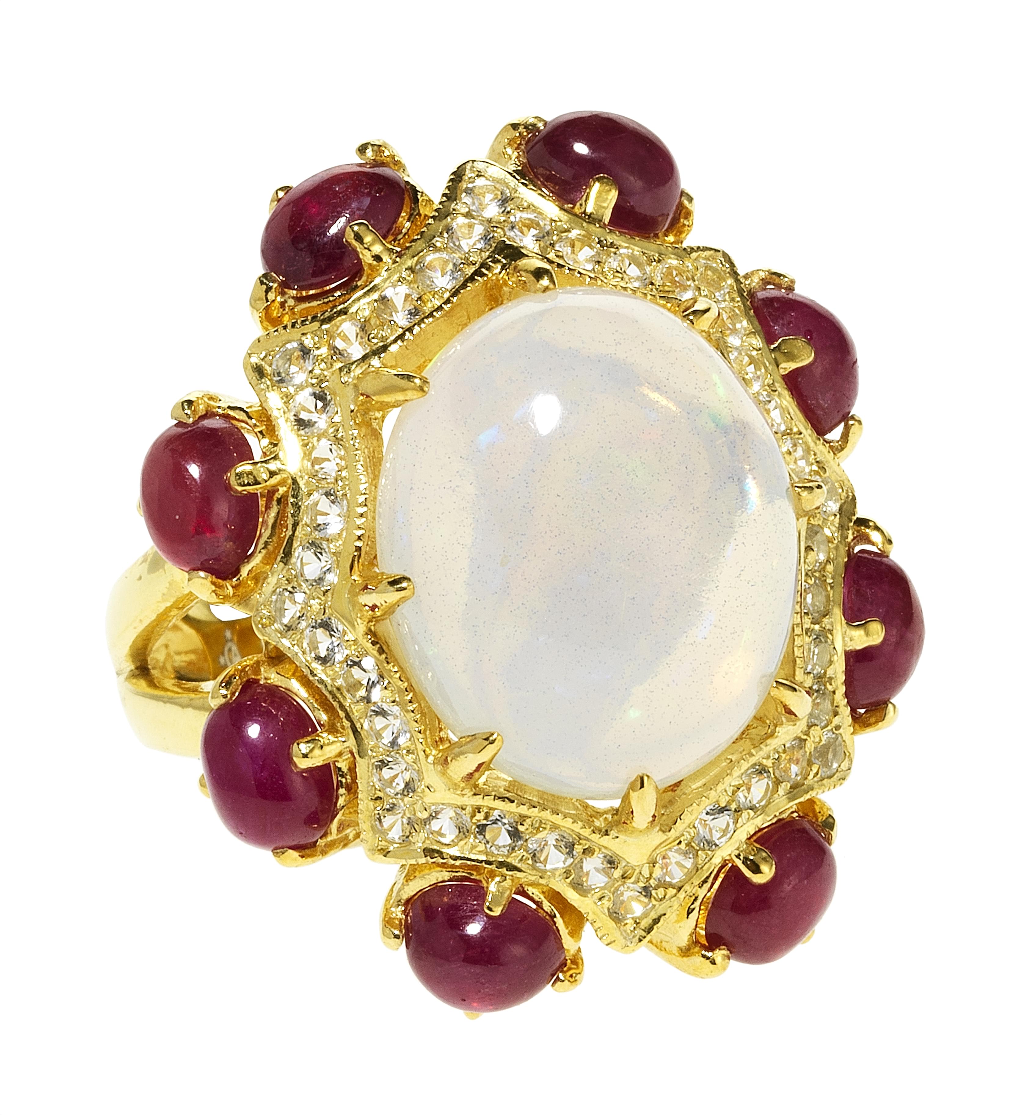 Entourée de topazes blanches et de rubis taille cabochon ovale, vermeil 925, doigt 52-12. Pour les lots précédés d'un *, la TVA de 7,7% est due sur l'entier du prix d'adjudication.