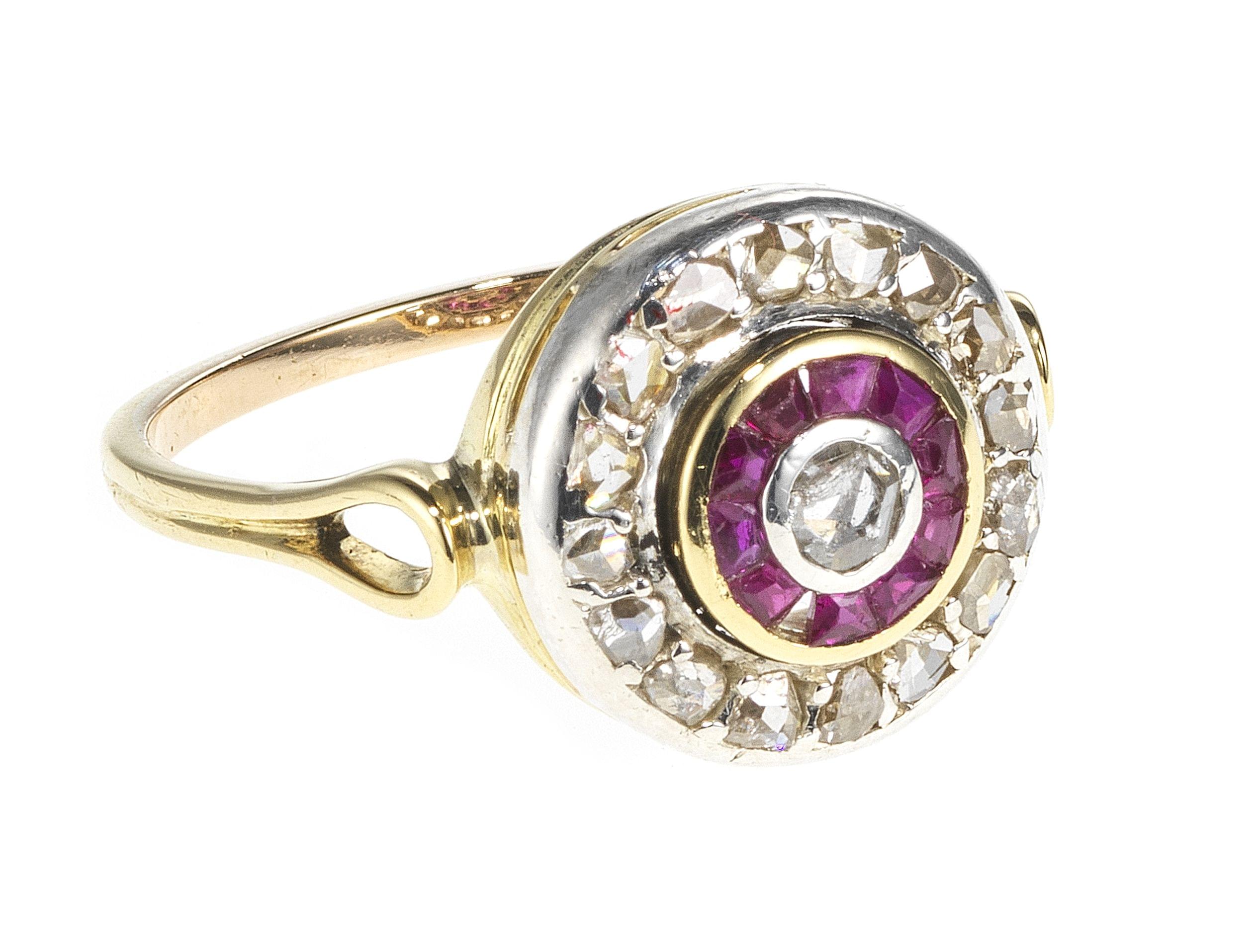 3282. Bague centrée d'une rose de diamant entourée de rubis calibrés et de roses de diamants