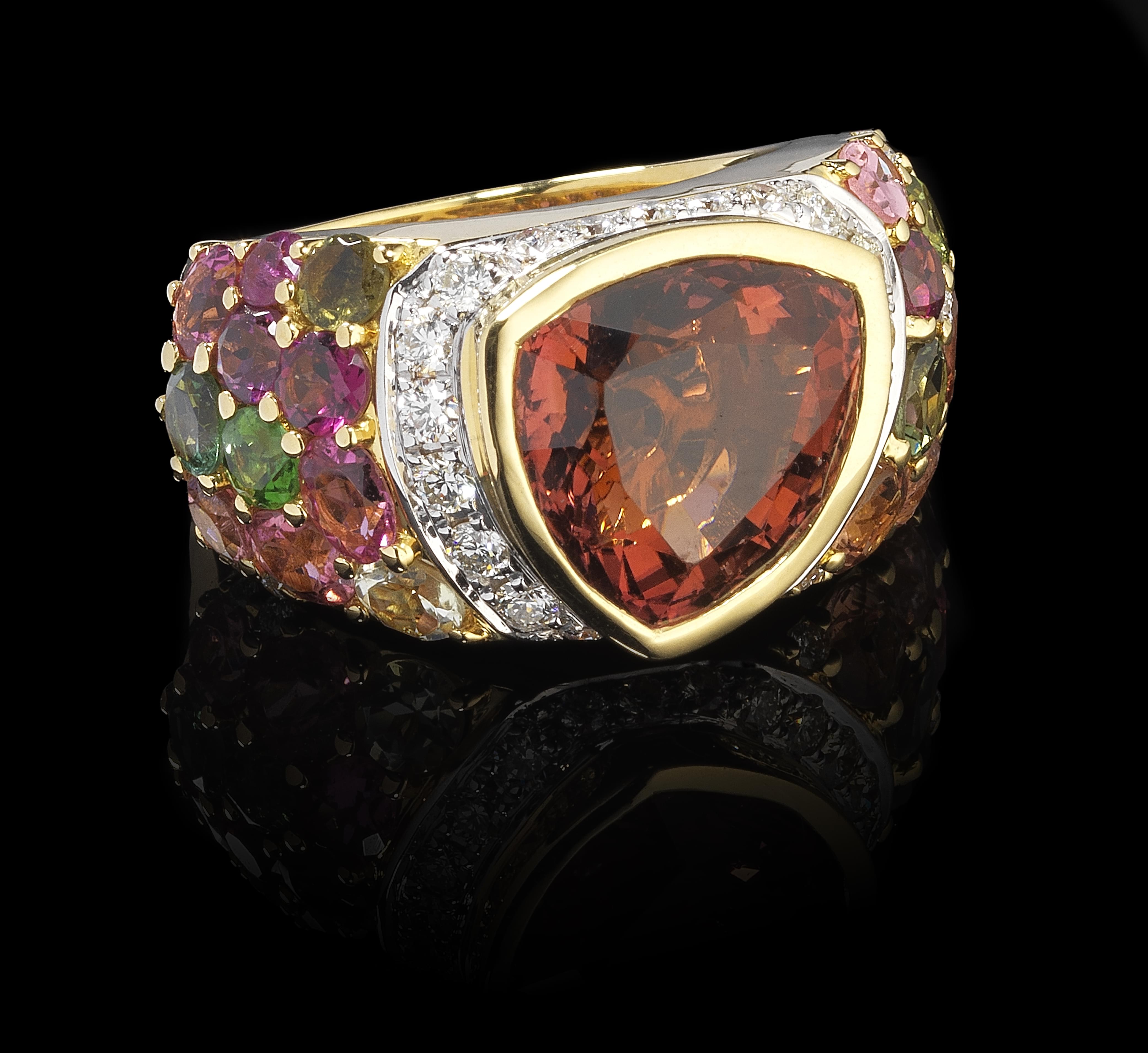 105. *Bague centrée d'une tourmaline rose-orangé taille fantaisie entourée de diamants et épaulée de pavages de tourmalines de couleur