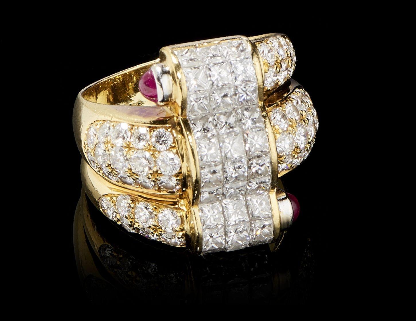 130. Bague centrée d'un motif pavé de diamants en serti invisible épaulés d'un pavage de diamants taille brillant et rehaussés de deux rubis cabochon