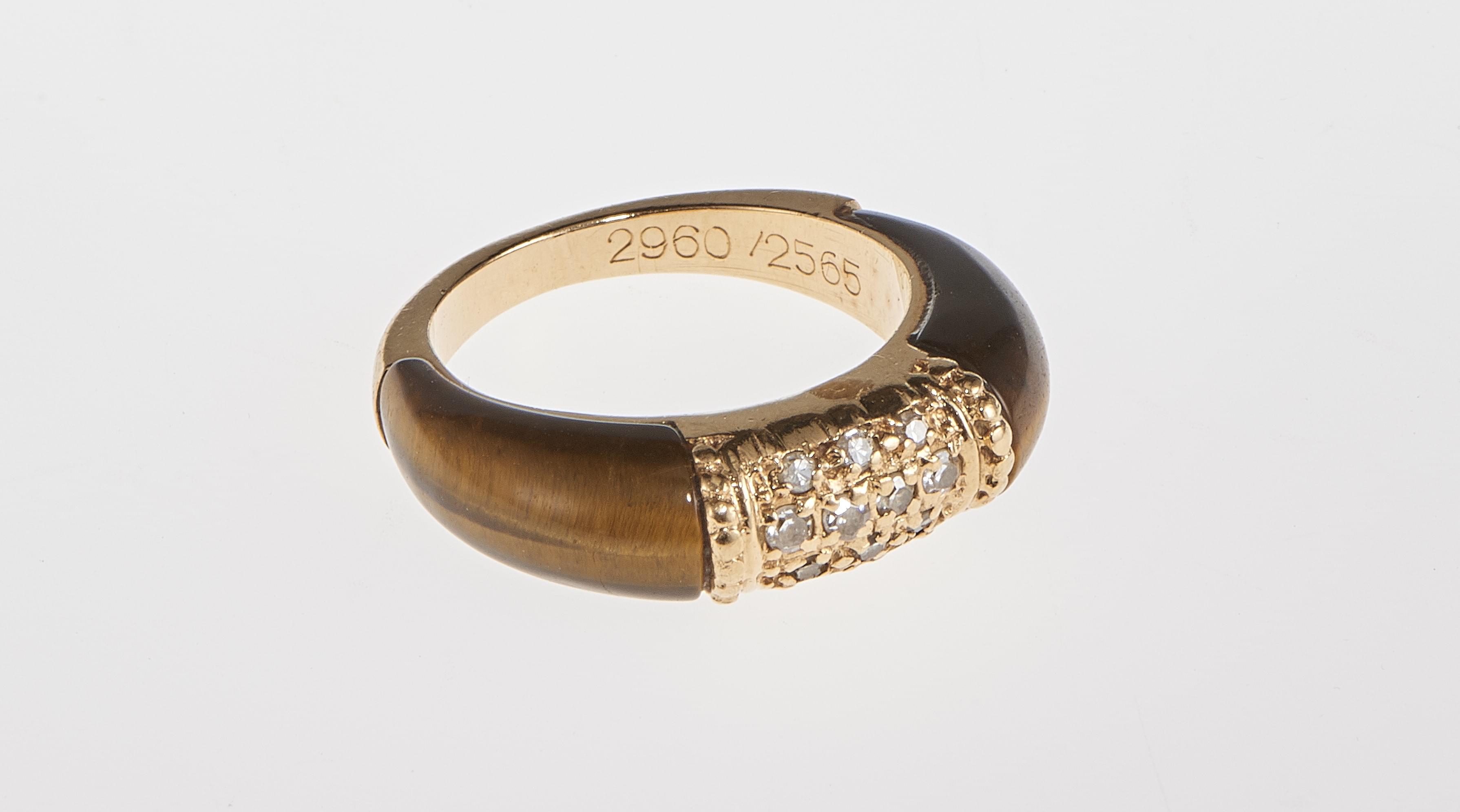 3146. Bague centrée d'un pavage de diamants épaulé d'œil de tigre, dans le goût de Van Cleef and Arpels