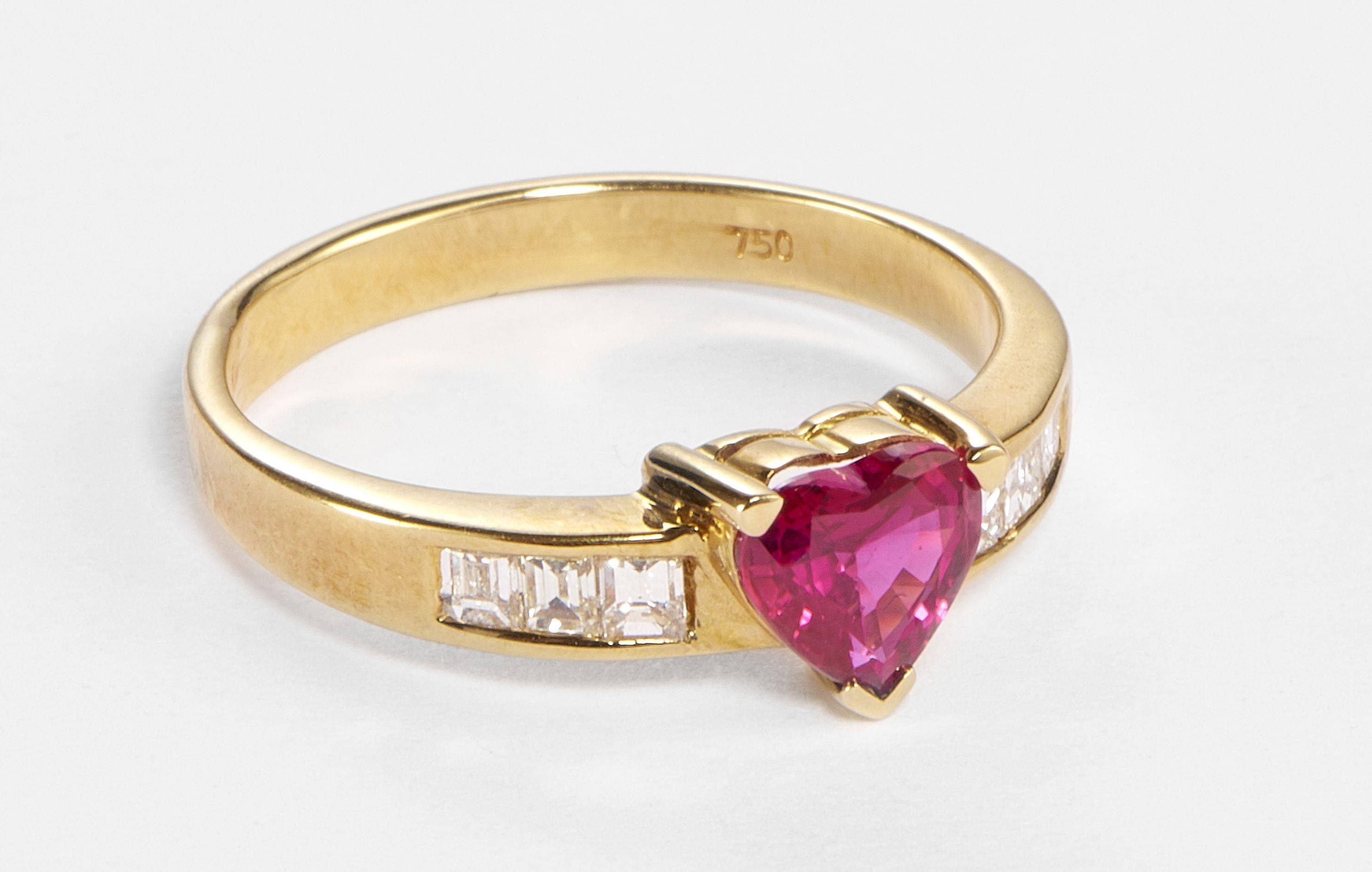3222. Bague centrée d'un rubis taille cœur épaulé de diamants taille princesse