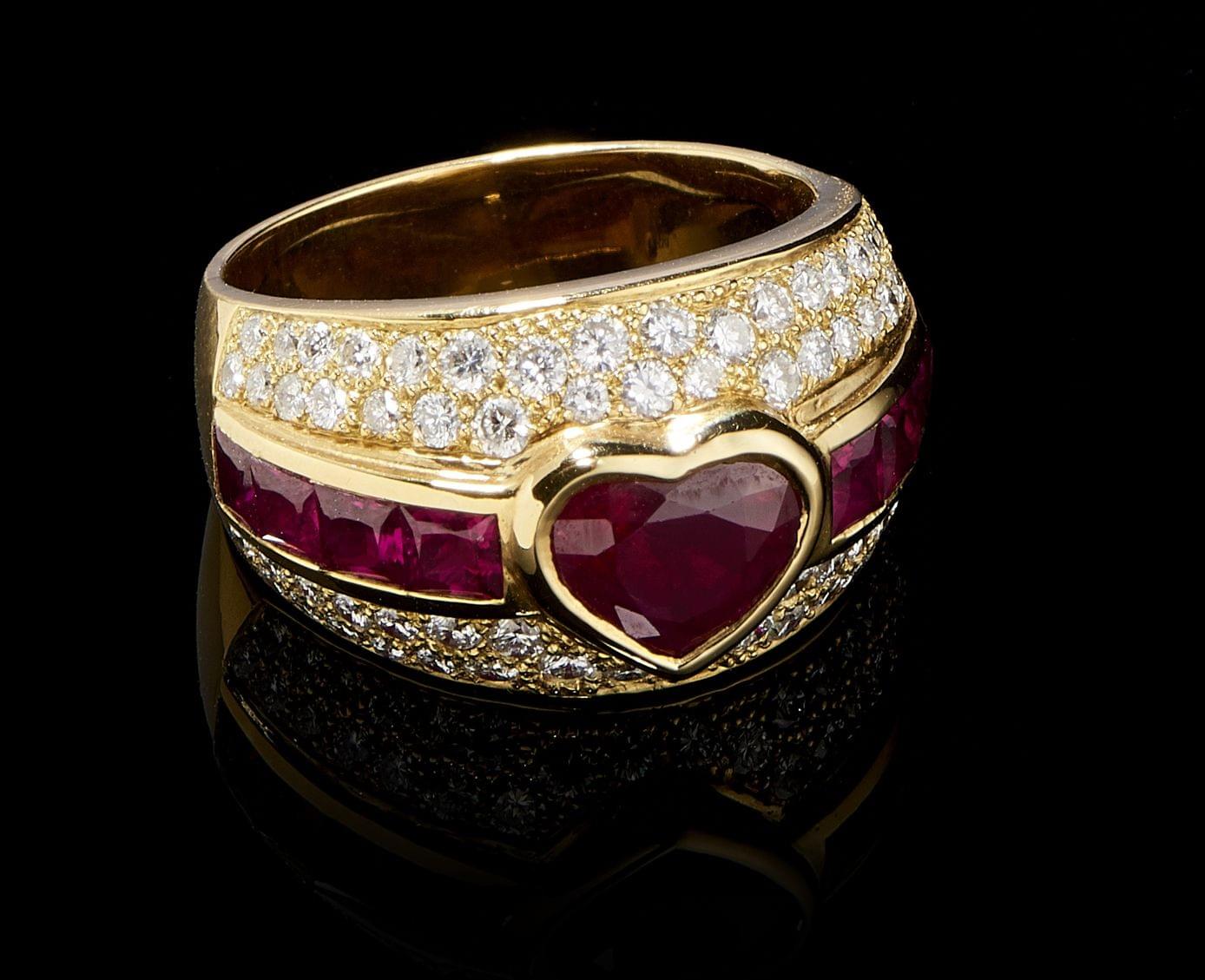 91. Bague centrée d'un rubis taille cœur épaulé de rubis calibrés et rehaussé de pavages de diamants (env. 1,4 ct)