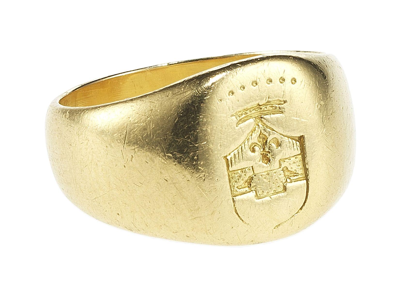 3275. Bague chevalière gravée d'un blason à fleur de lys surmonté d'une couronne à sept branches