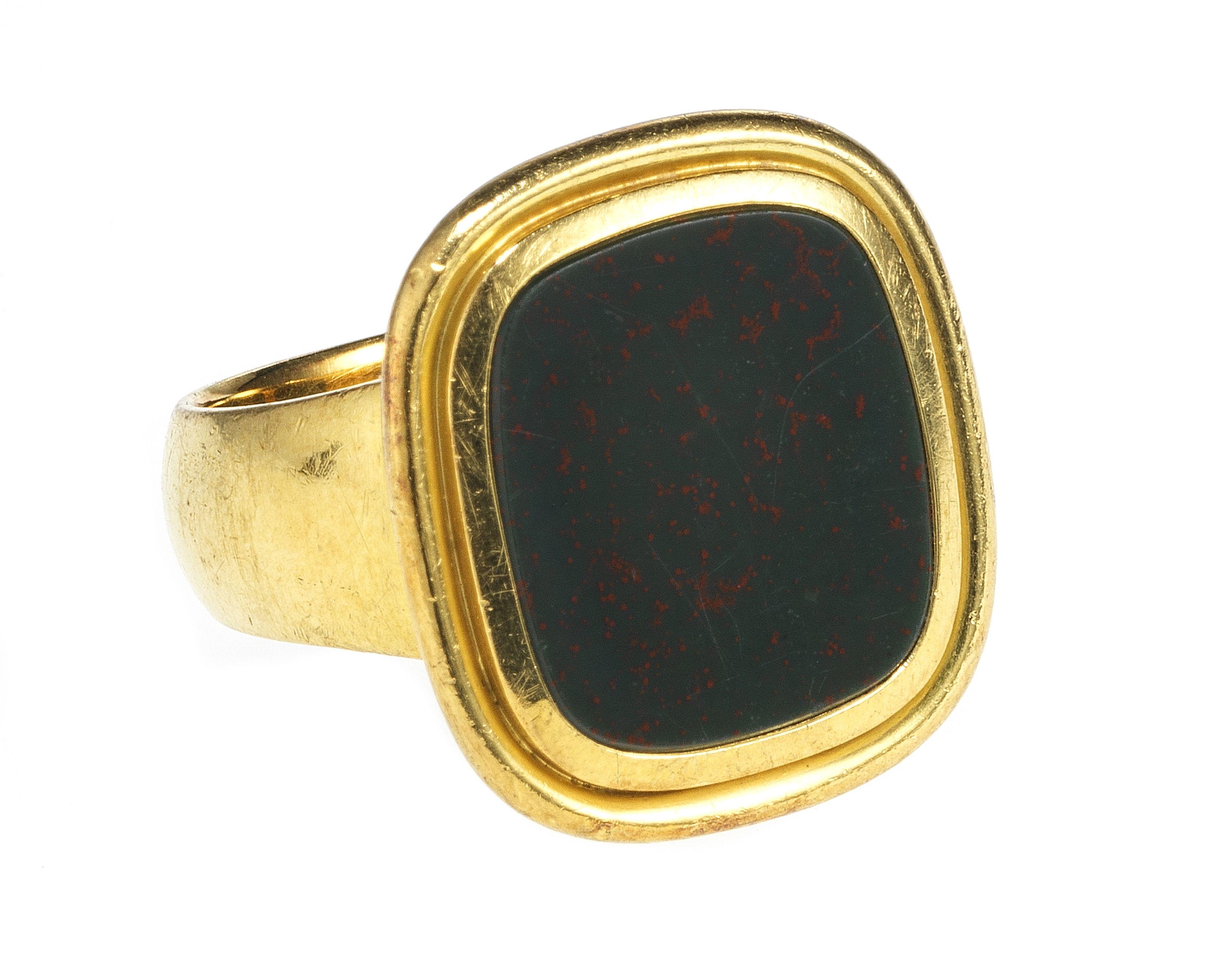 3364. Bague-chevalière sertie d'une plaque de jaspe sanguin
