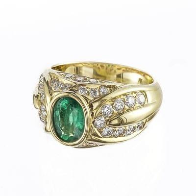 263. Bague chevalière sertie d'une émeraude ovale (env. 1 ct) épaulée de diamants (env. 1 ct)