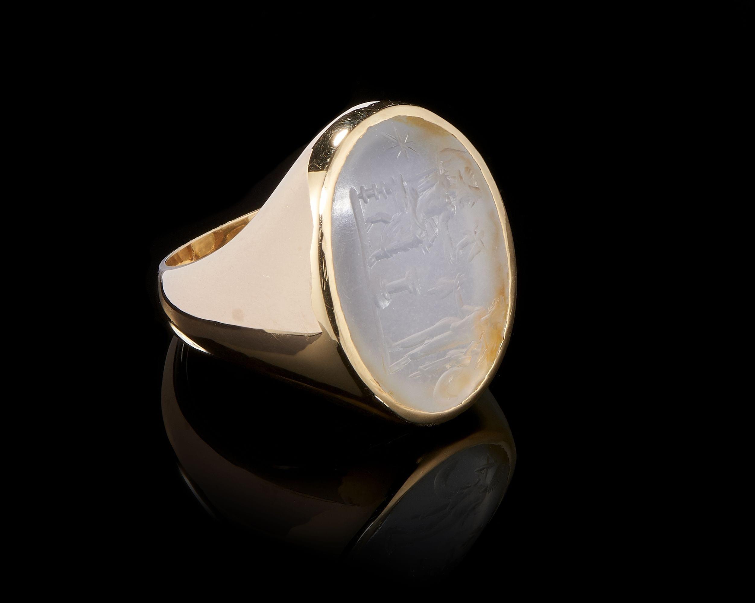 937. Bague chevalière sertie d'une intaille sur calcédoine dans le style antique représentant Jupiter et Mercure