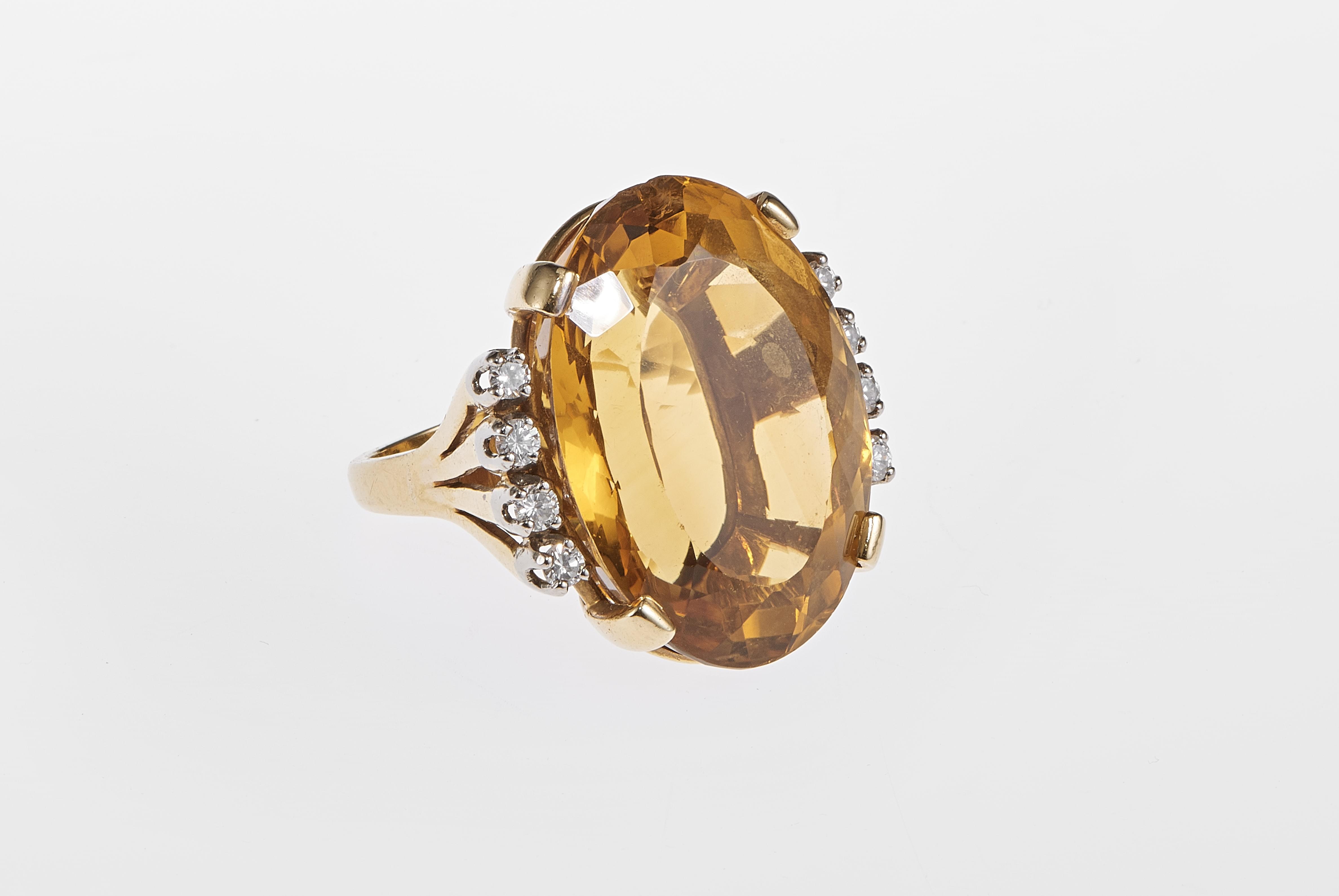 3316. Bague citrine sertie d'une citrine taille ovale (env. 40 ct) épaulée de huit petits diamants