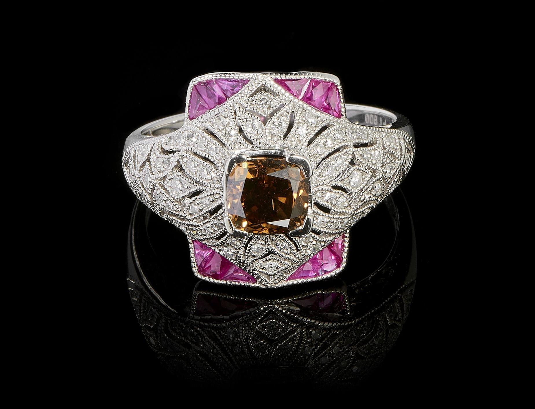 Centrée d'un diamant brun (env. 1 ct) rehaussé de diamants et de rubis calibrés, platine 900, doigt 54-14, poids brut 5 g