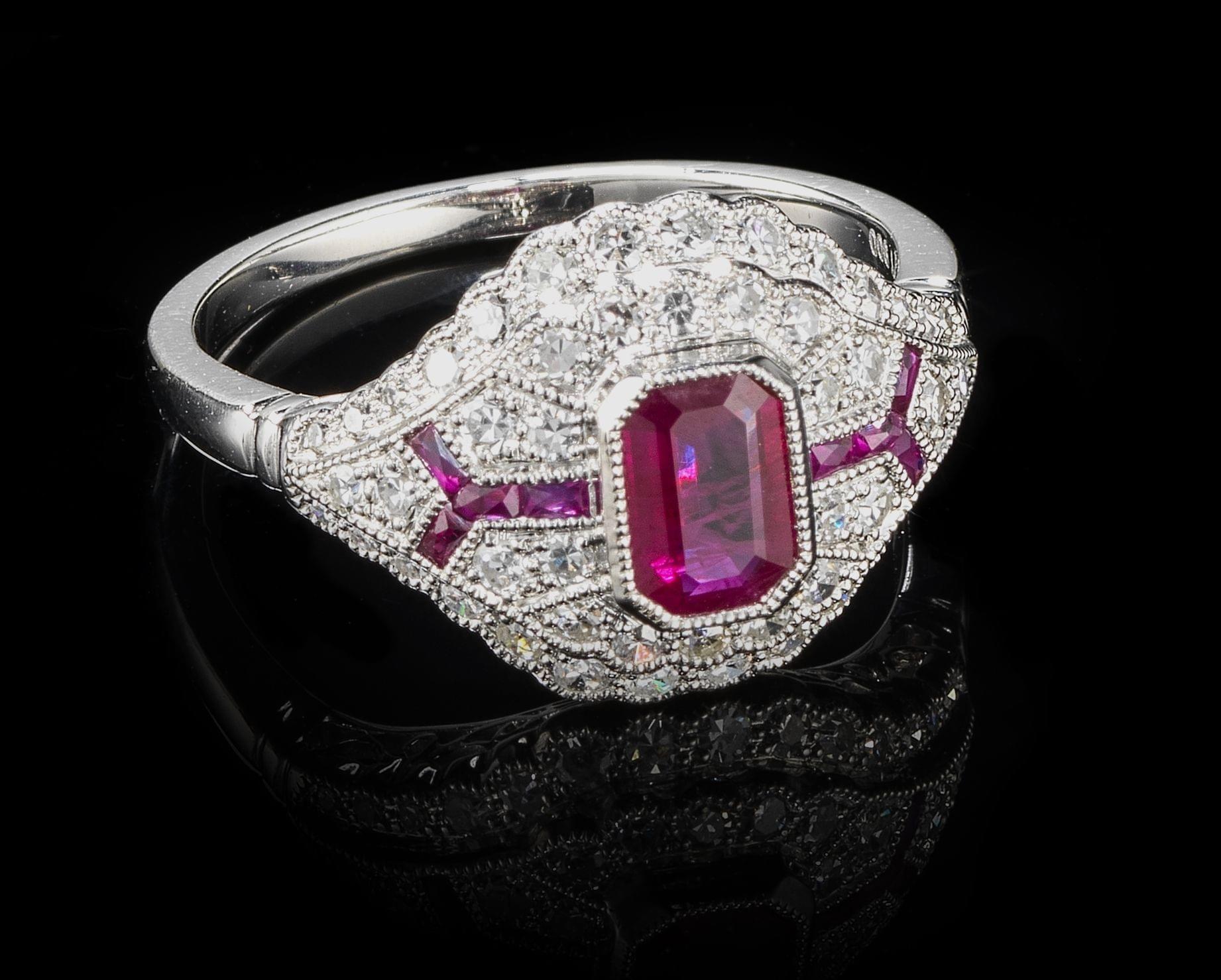 Centrée d'un rubis birman taille émeraude (env. 0,5 ct) épaulé de rubis calibrés sur une monture pavée de diamants (env. 0,5 ct), platine 900, doigt 54-14, 4 g, accompagnée d'un certificat GFCO. Pour les lots précédés d’un *, la TVA de 7.7% est due sur l’entier du prix d’adjudication.