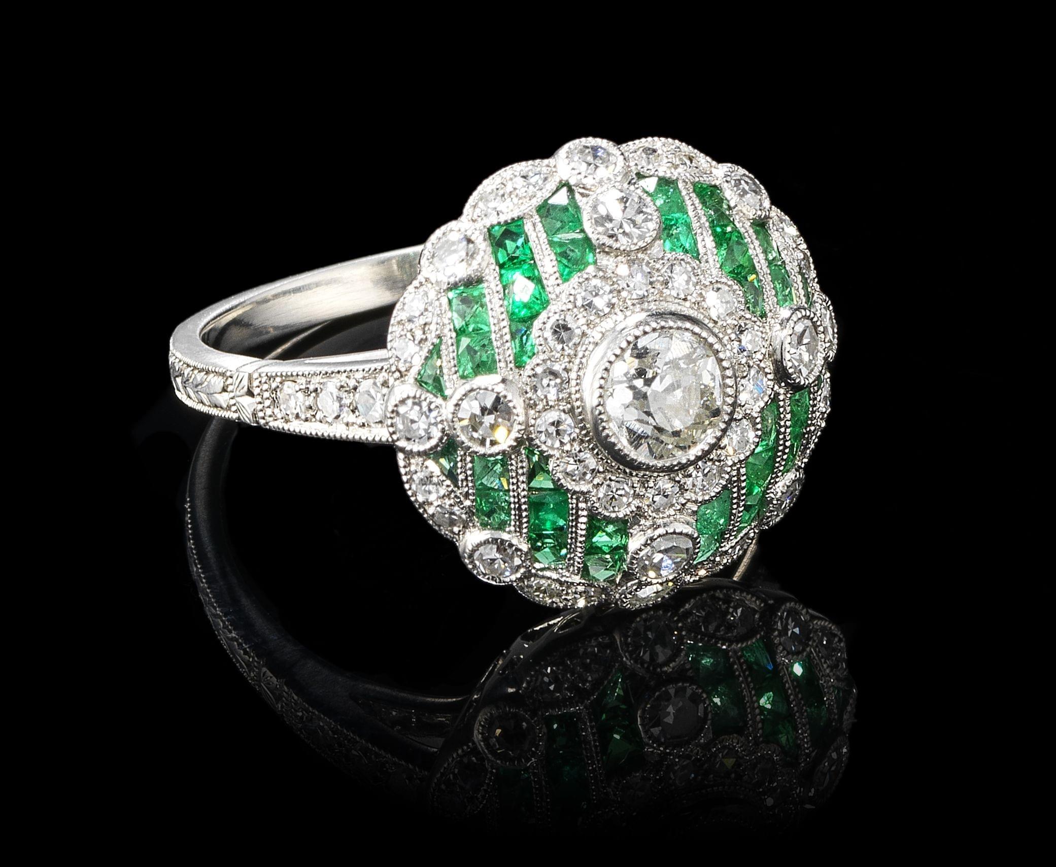 Sertie d'un diamant taille ancienne (env. 0,3 ct) sur une monture ornée de lignes d'émeraudes calibrées et rehaussée de diamants, platine 900, doigt 52-12, 5 g, accompagnée de son certificat GRA. Pour les lots précédés d’un *, la TVA de 7.7% est due sur l’entier du prix d’adjudication.
