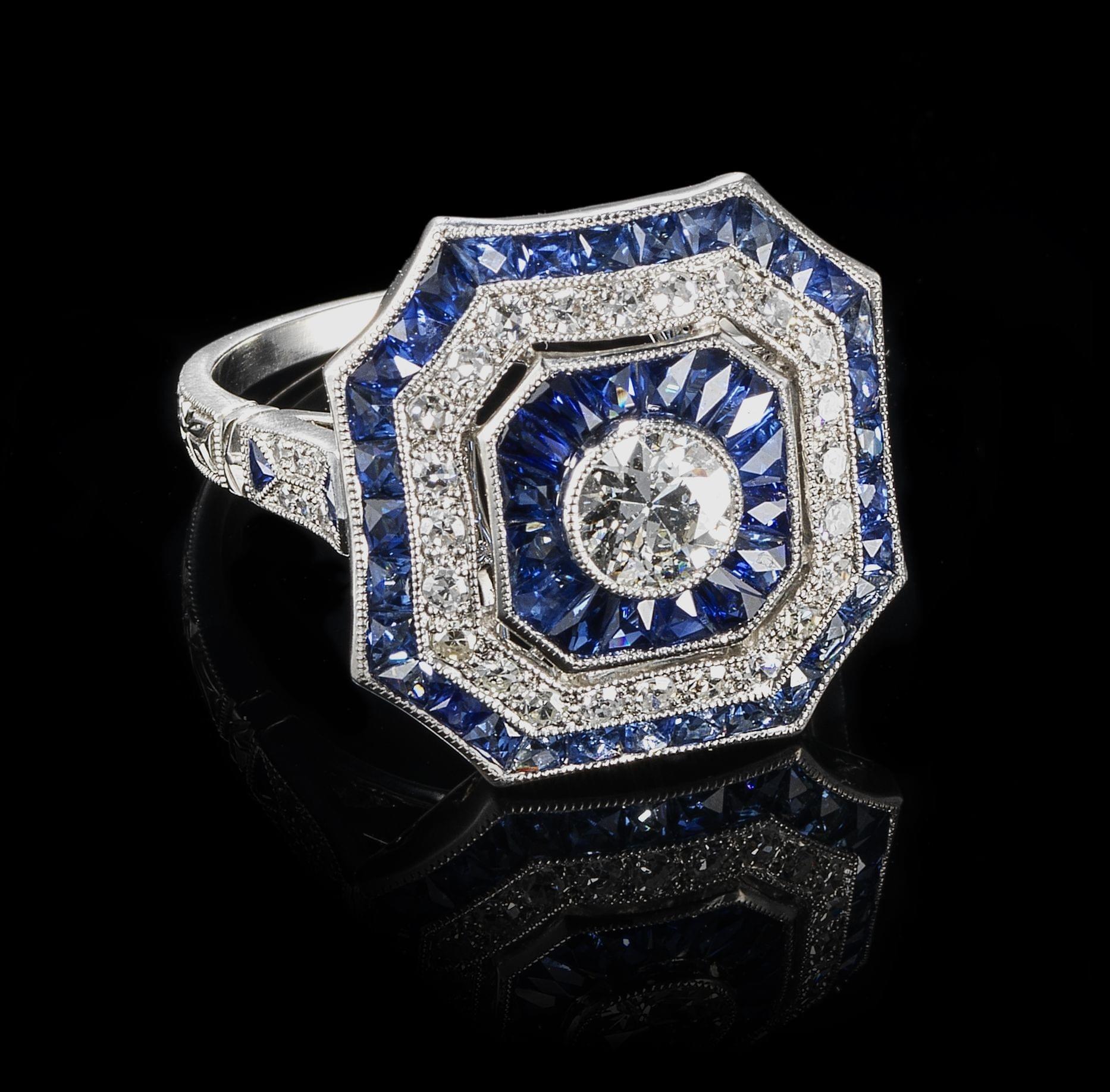 Centrée d'un diamant taille ancienne (env. 0,35 ct), entourée de saphirs calibrés et d'une ligne de diamants, platine 900, doigt 53-13, 7 g, accompagnée de son certificat GRA. Pour les lots précédés d’un *, la TVA de 7.7% est due sur l’entier du prix d’adjudication.