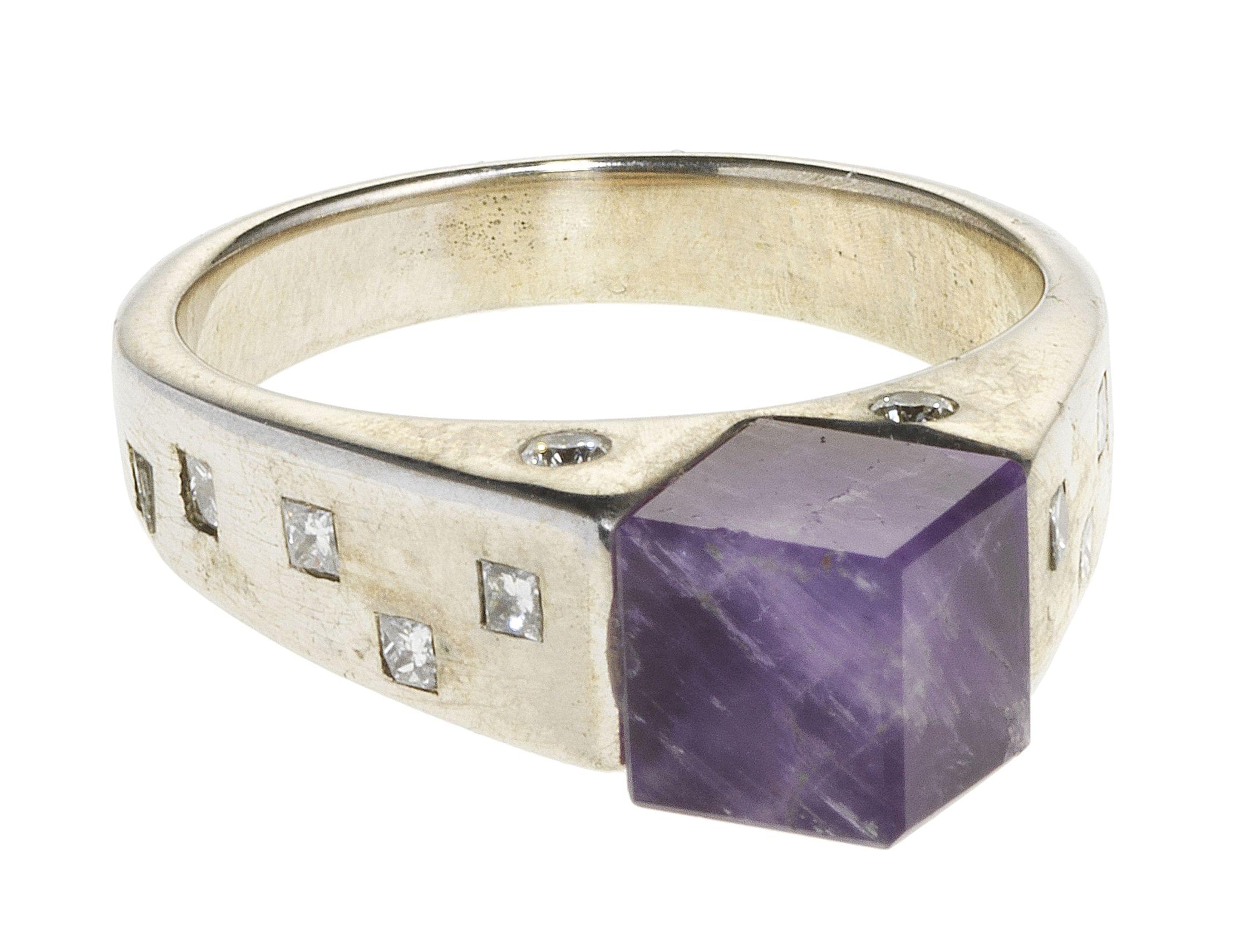 3248. *Bague design sertie d'un cube d'améthyste sur une monture ponctuée de diamants