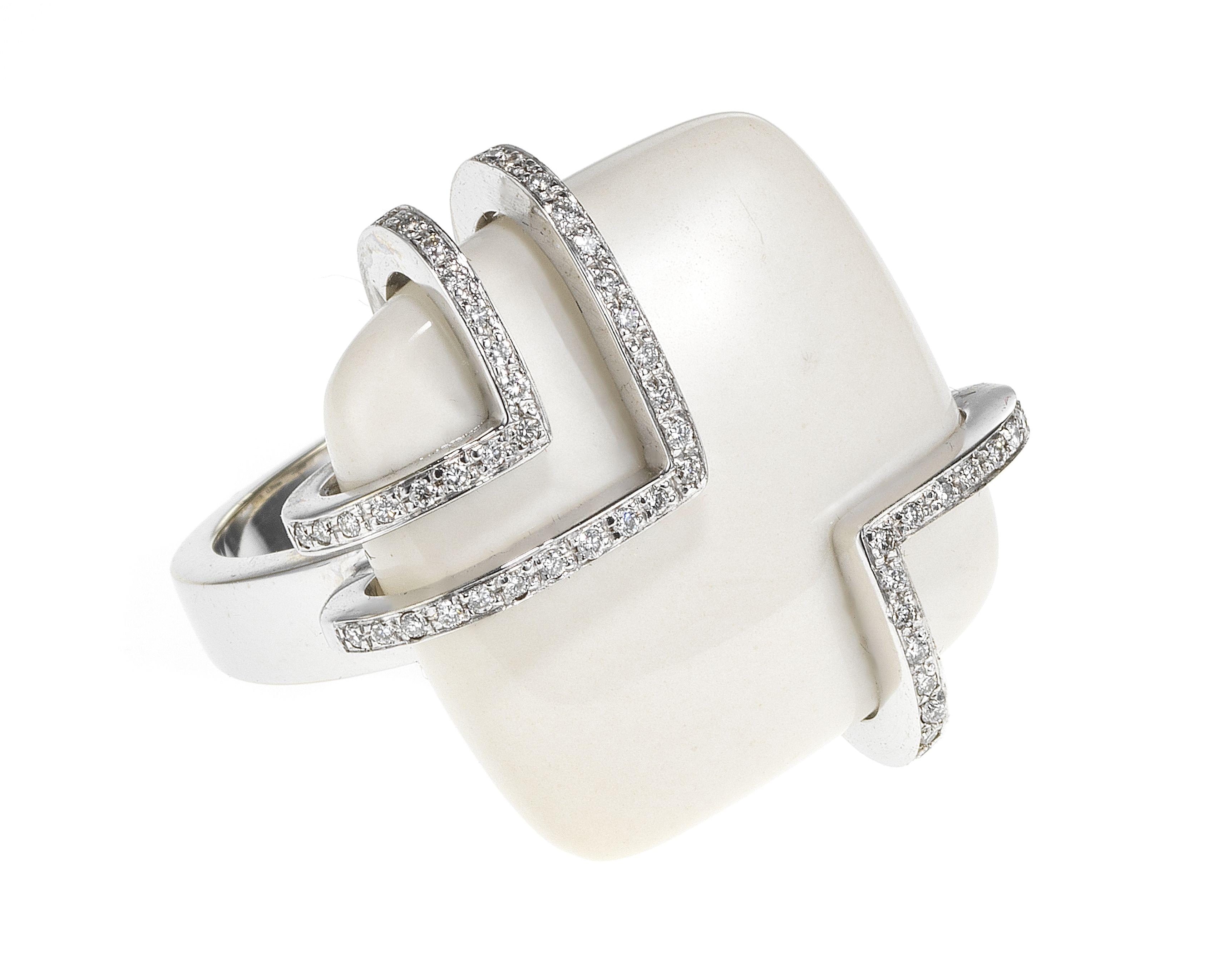 3306. Bague design sertie d'un jaspe blanc retenu par des motifs de chevrons sertis de diamants
