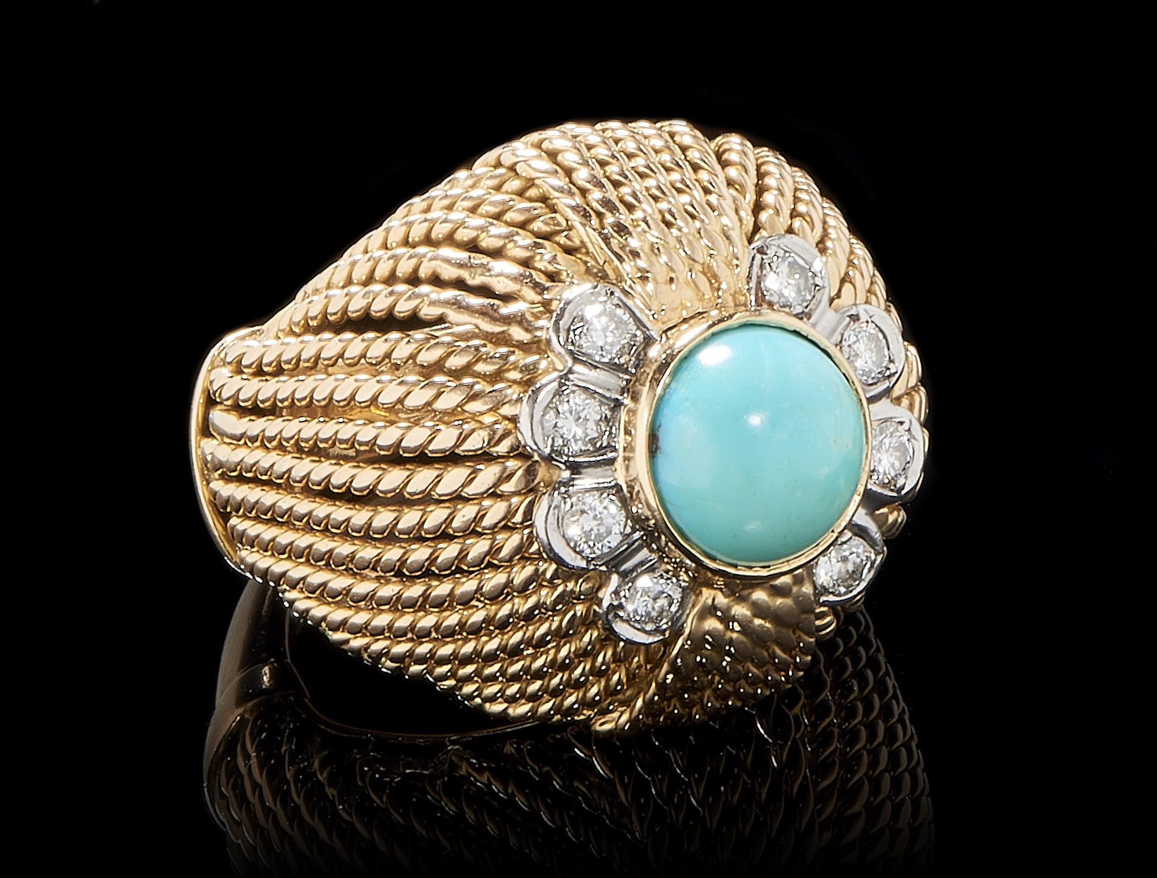 991. Bague dôme sertie d'une turquoise ronde en cabochon entourée de diamants
