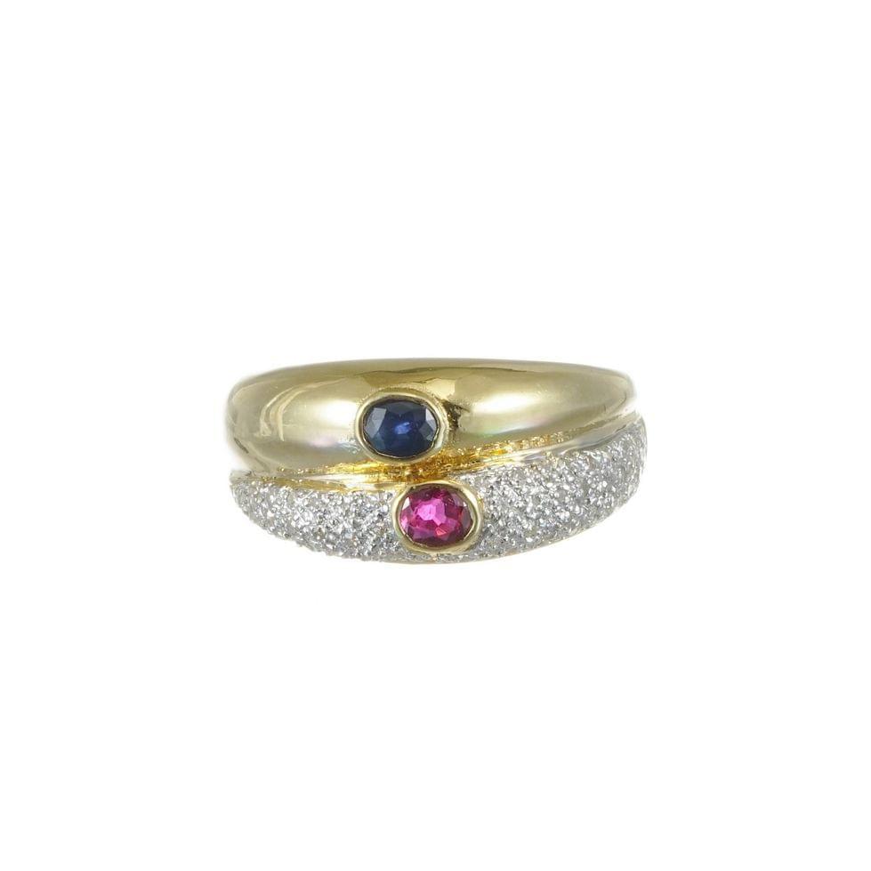 3248. Bague double anneau, l'un serti d'un saphir ovale et l'autre d'un rubis ovale dans un pavage de diamants