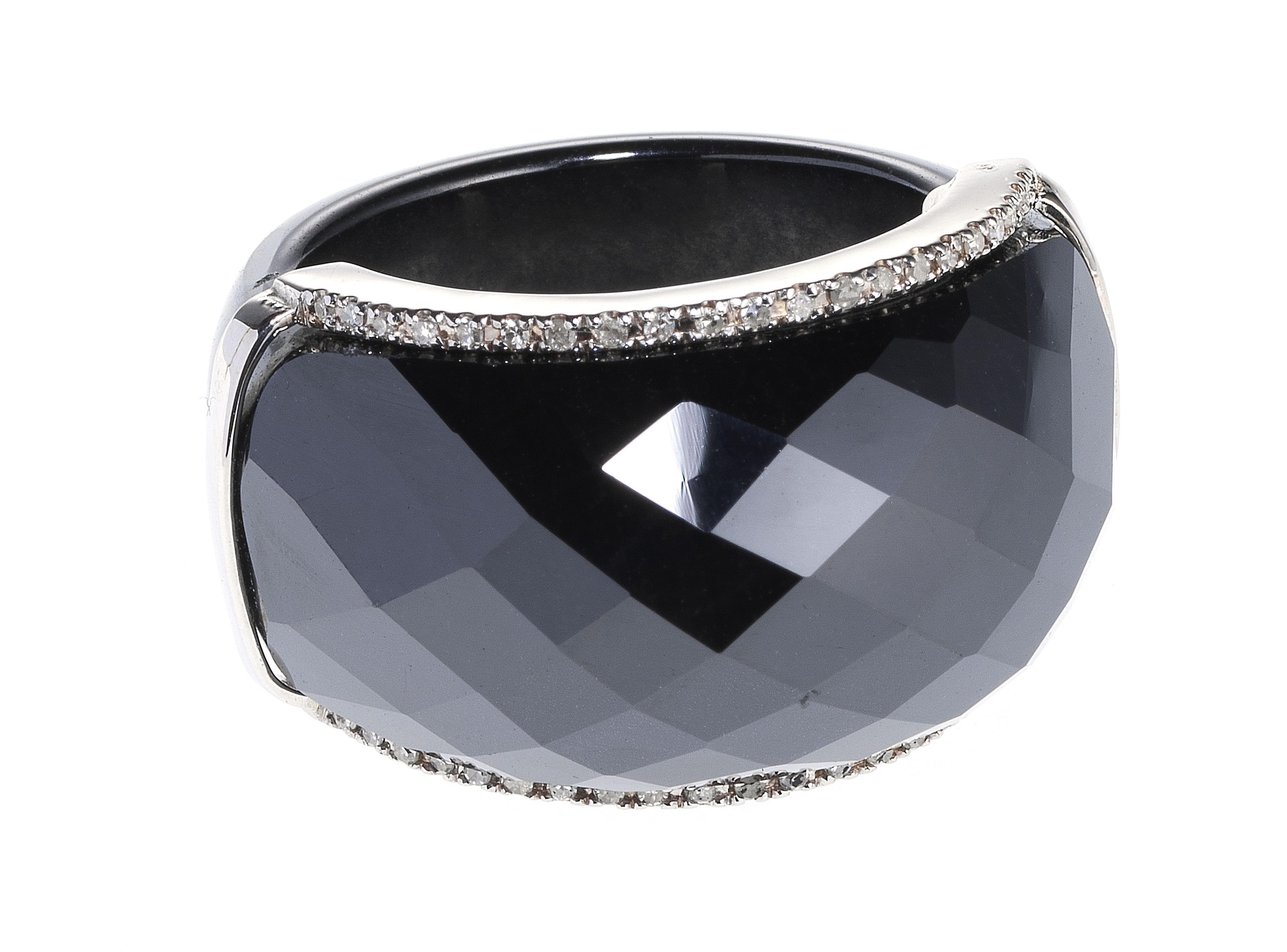 3232. *Bague en onyx facetté rehaussé de deux lignes de diamants