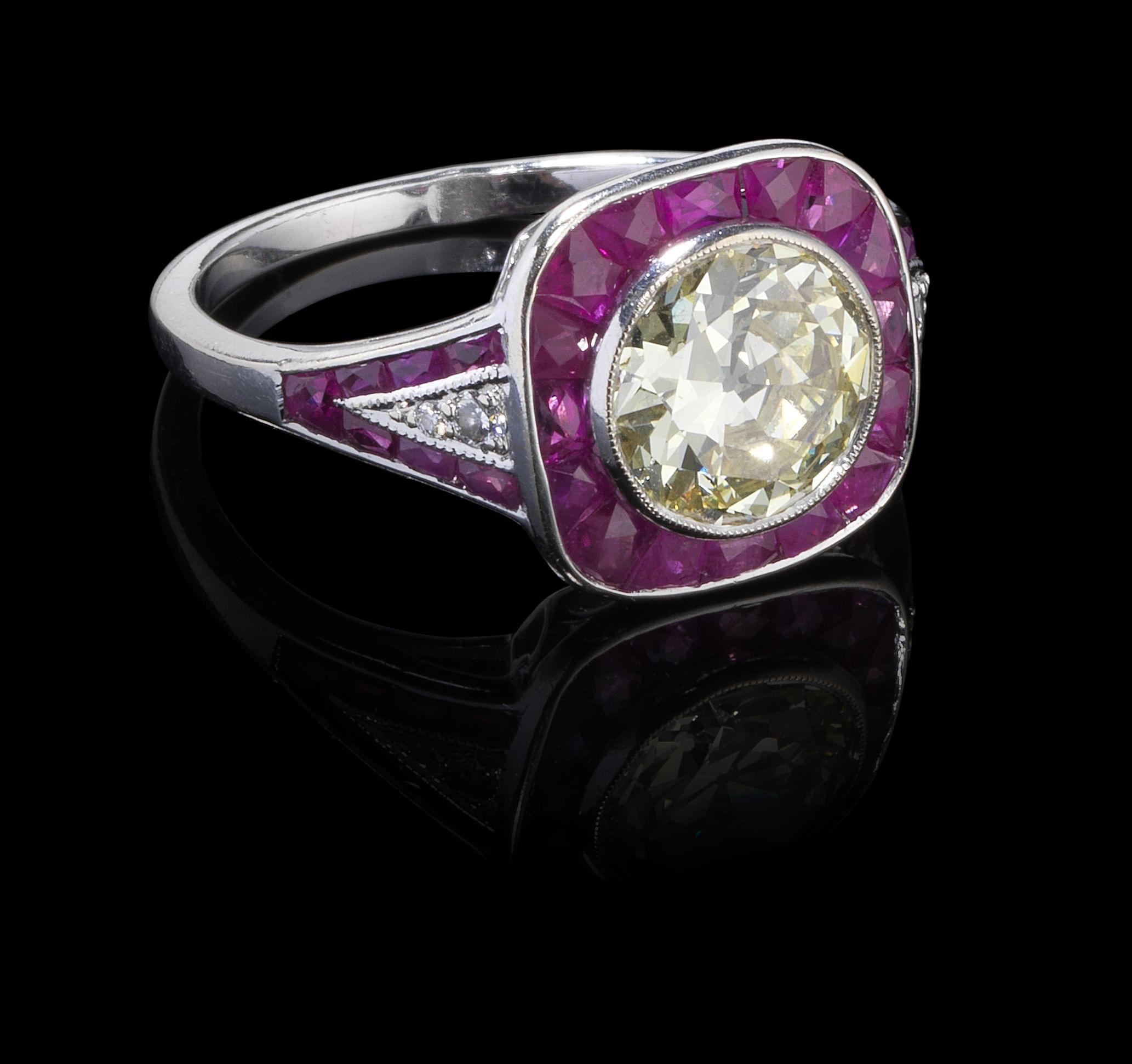 234. *Bague époque Art déco centrée d'un diamant taille ancienne (env. 1,4 ct) entouré de rubis calibrés et rehaussé de diamants