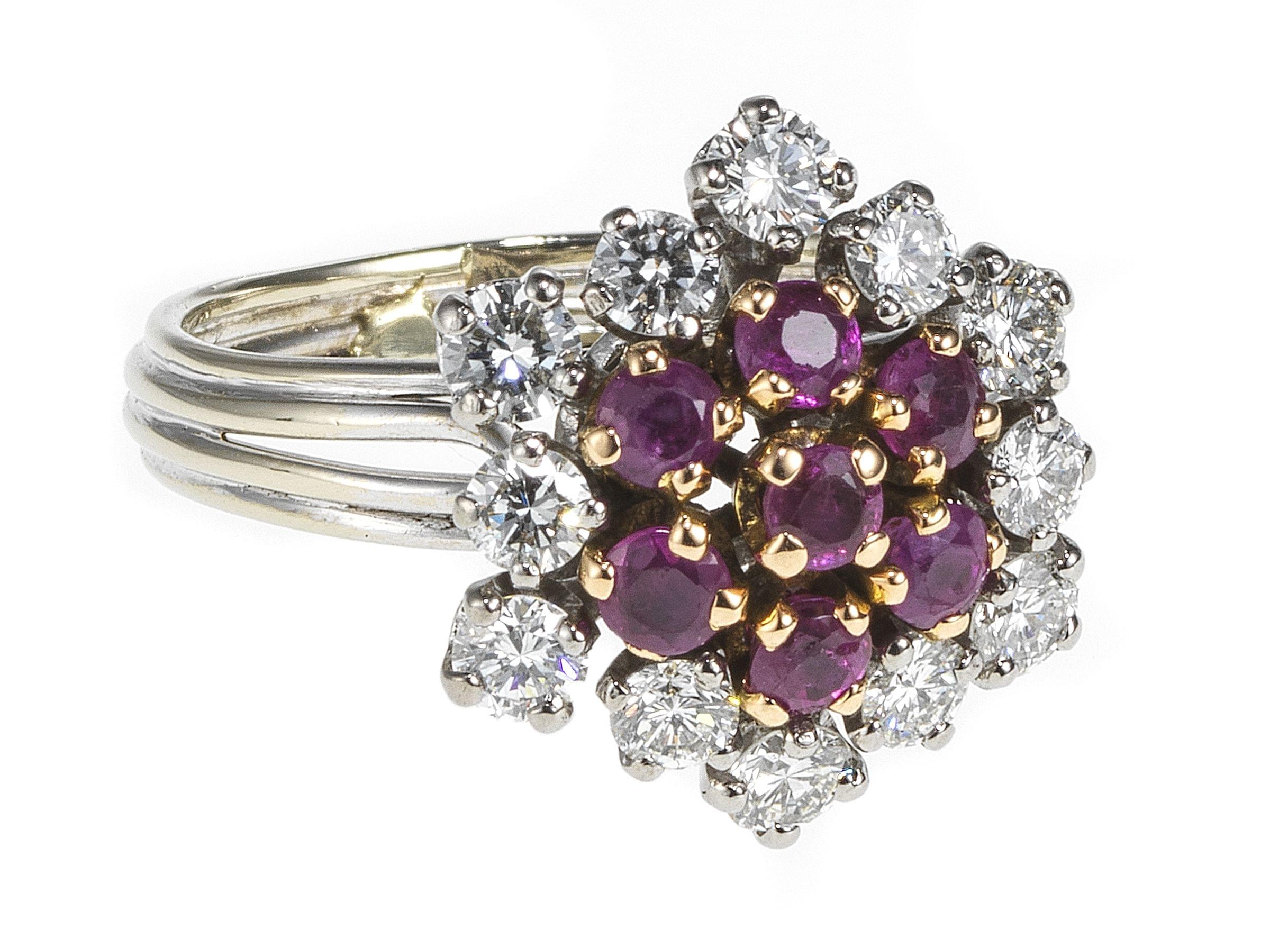 3281. Bague fleur au cœur pavé de rubis et entouré de diamants