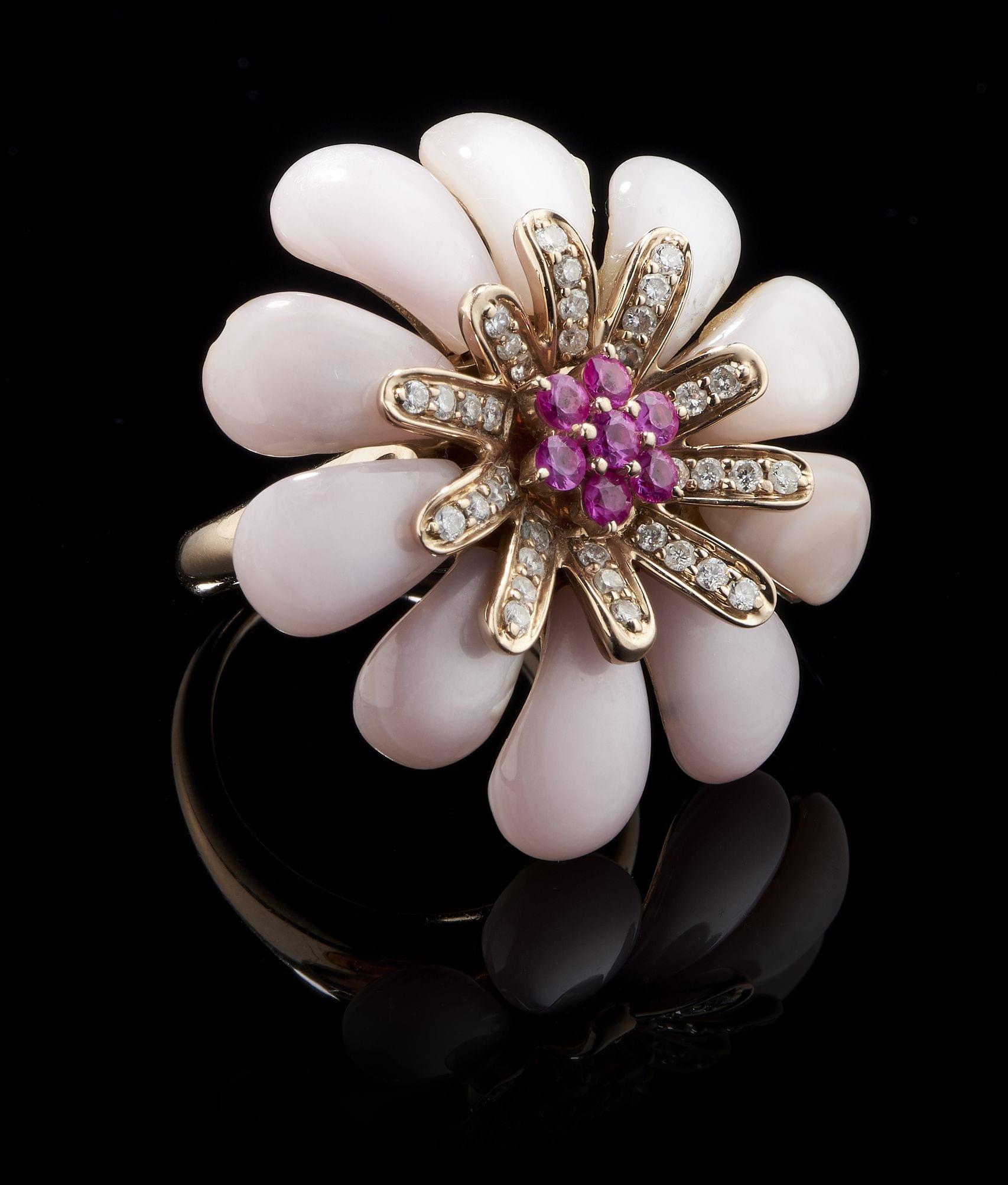 134. Bague fleur au cœur serti de rubis et diamants et aux pétales sertis de nacre