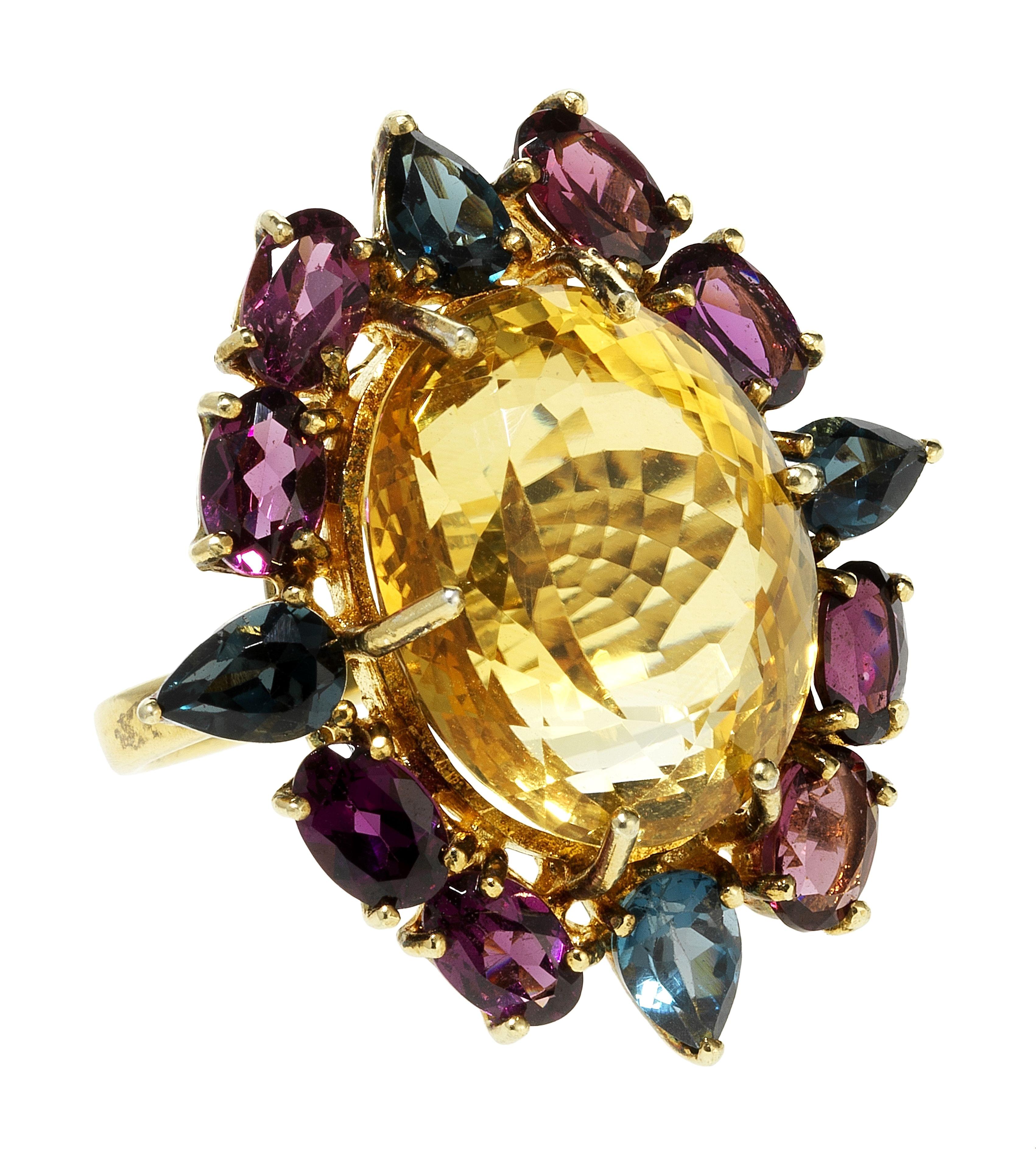 Entourée de rhodolite taille ovale et de topazes bleues London taille poire, vermeil 925, doigt 55-15. Pour les lots précédés d'un *, la TVA de 7,7% est due sur l'entier du prix d'adjudication.