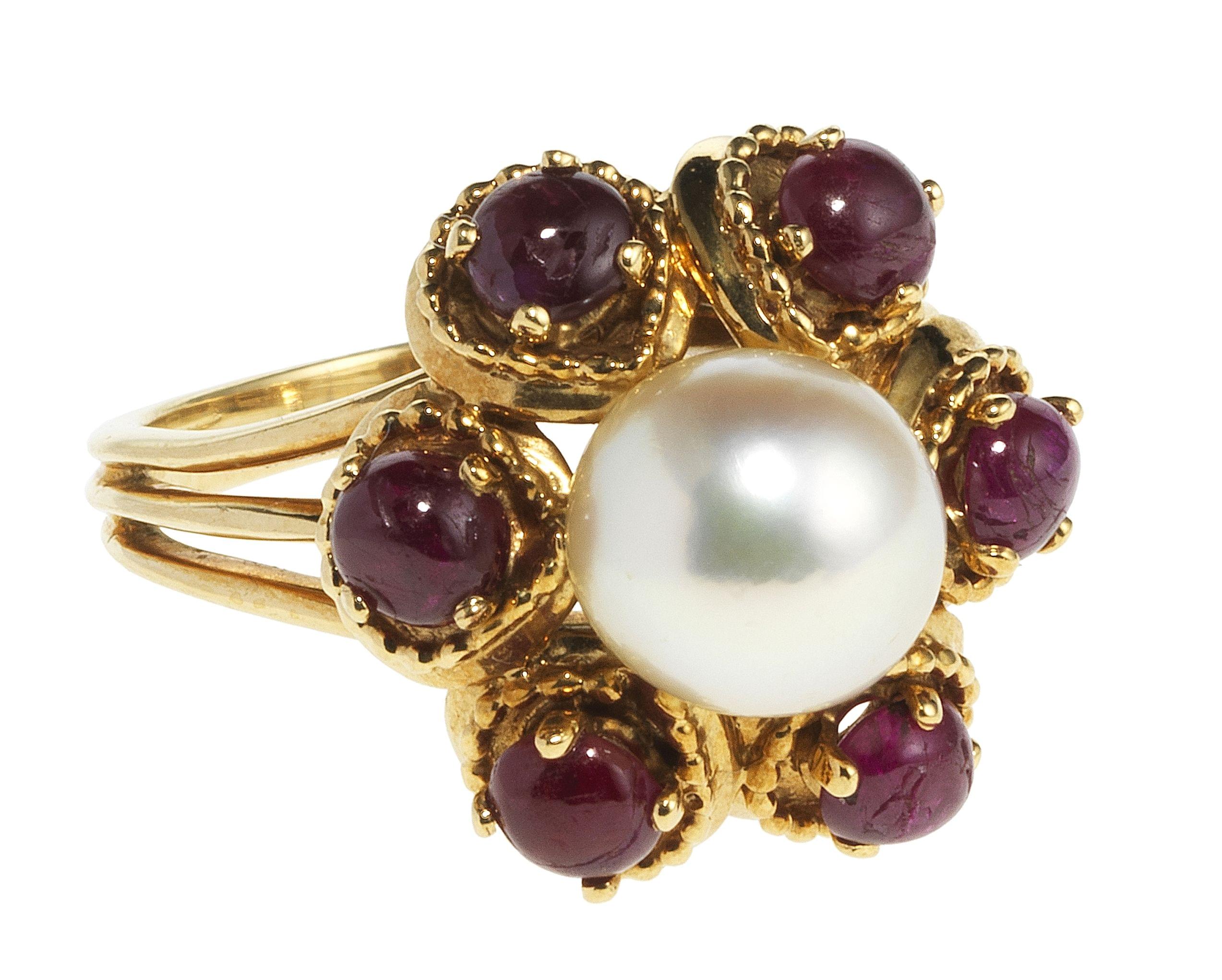 3207. Bague fleur centrée d'une perle (D env. 7,5 mm) entourée de six rubis taille cabochon