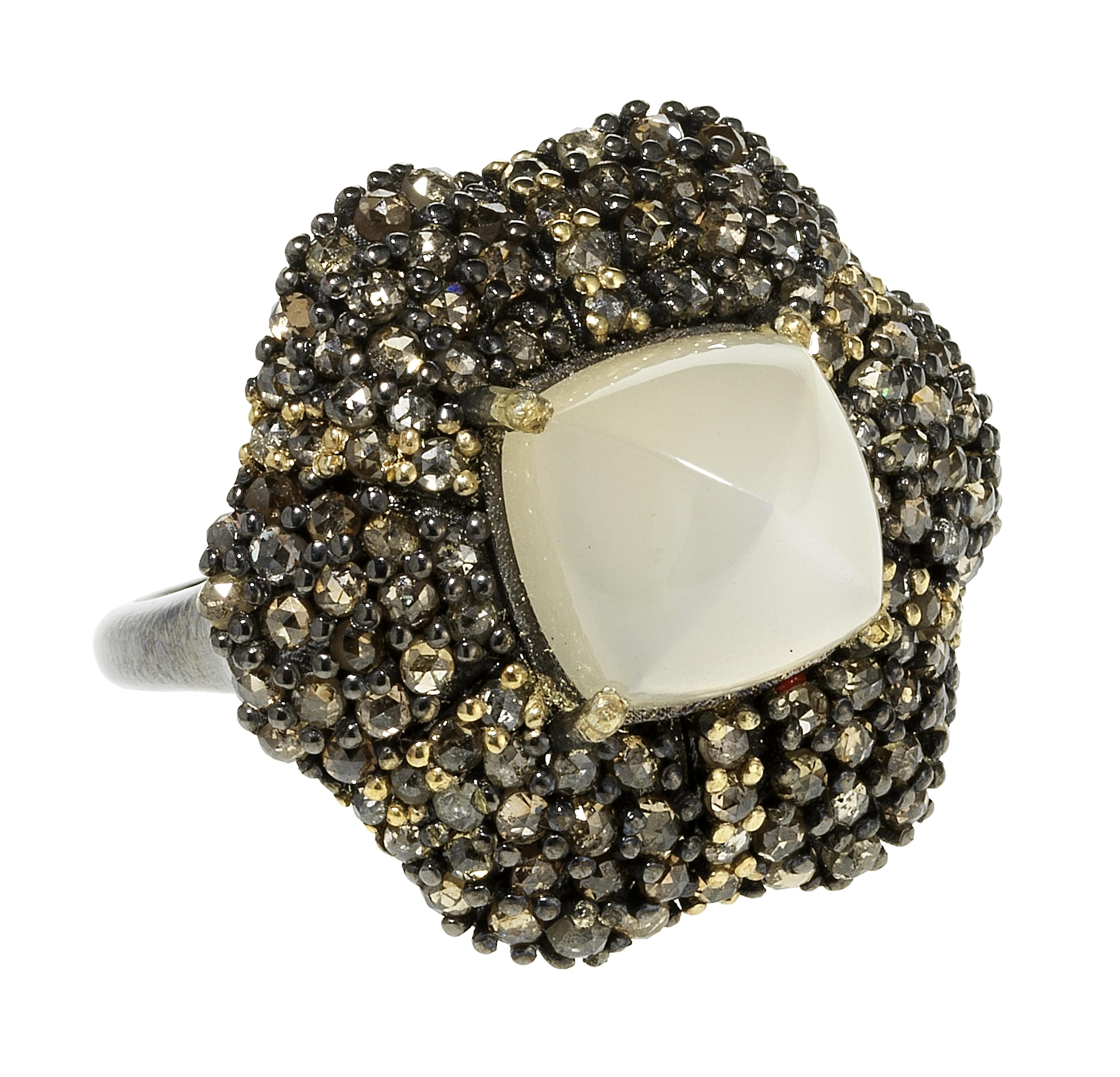 3133. *Bague fleur centrée d'une pierre de Lune en pain de sucre (env. 4,4 ct)