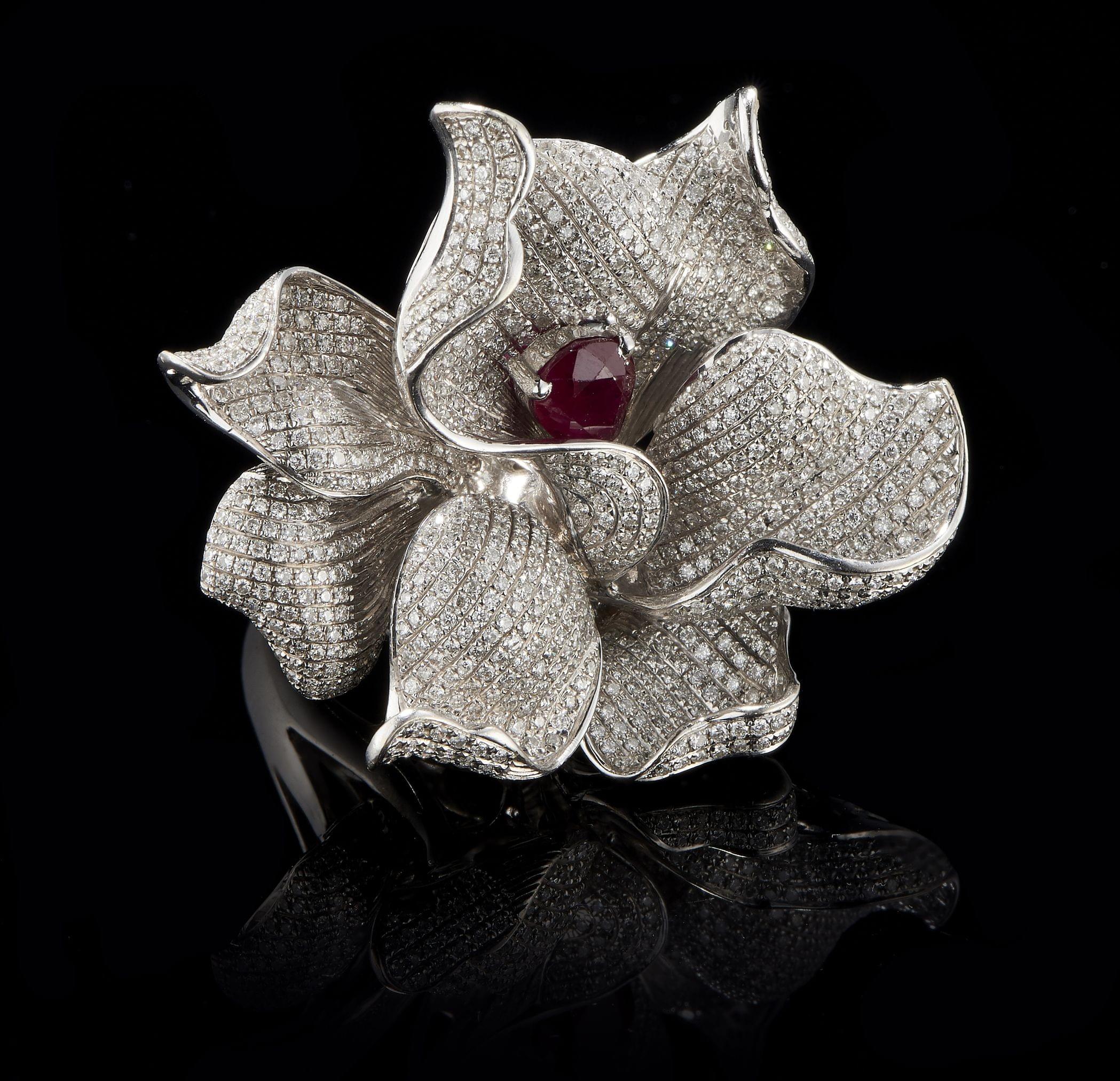 177. Bague fleur pavée de diamants et ornée d'un rubis taille poire